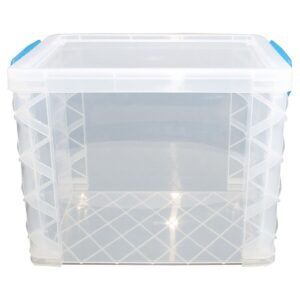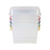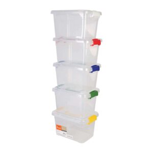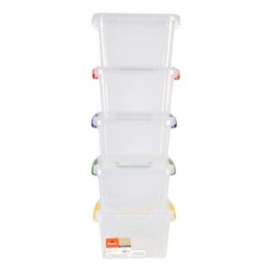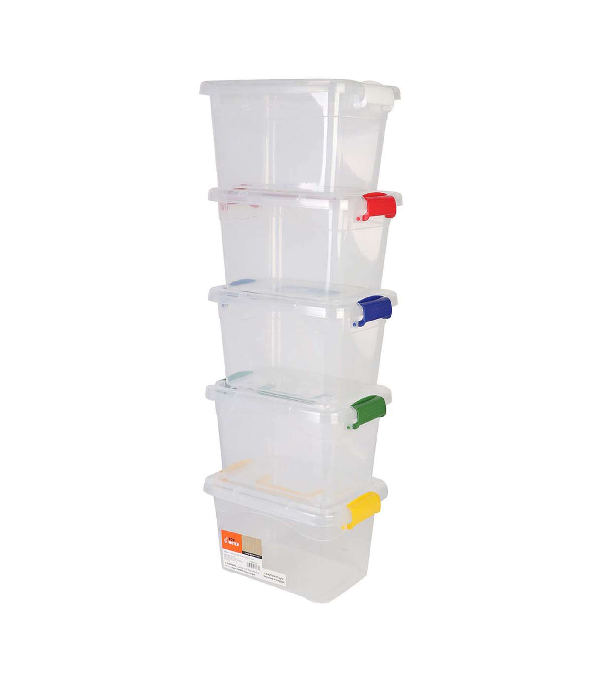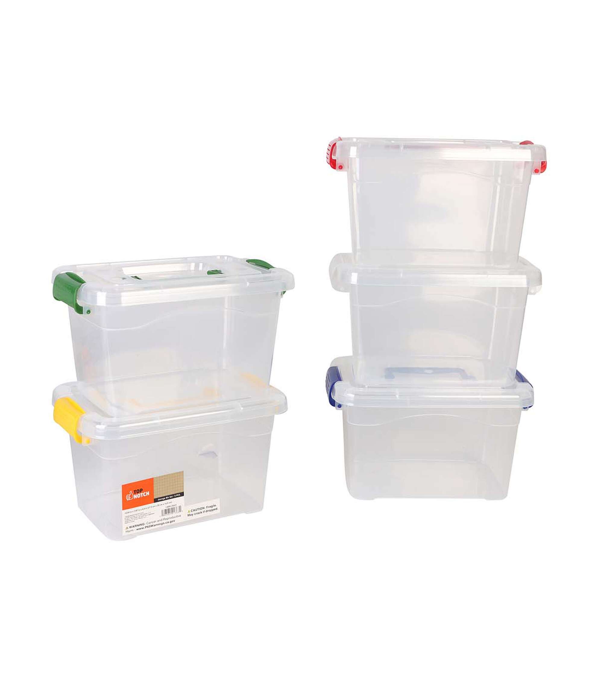 Keep your craft supplies, newspapers, books, and more organized with the Top Notch Storage Box Set. This pack includes five clear latching plastic storage bins with a handle for ease of carrying. The latch closures ensure that your items stay secure and protected. The bins come in five assorted colors, so you can easily color-code your supplies.