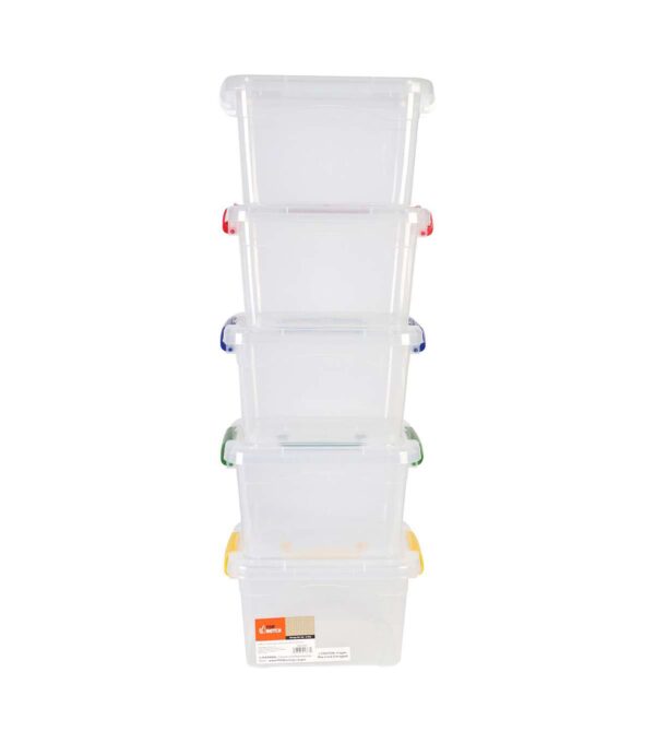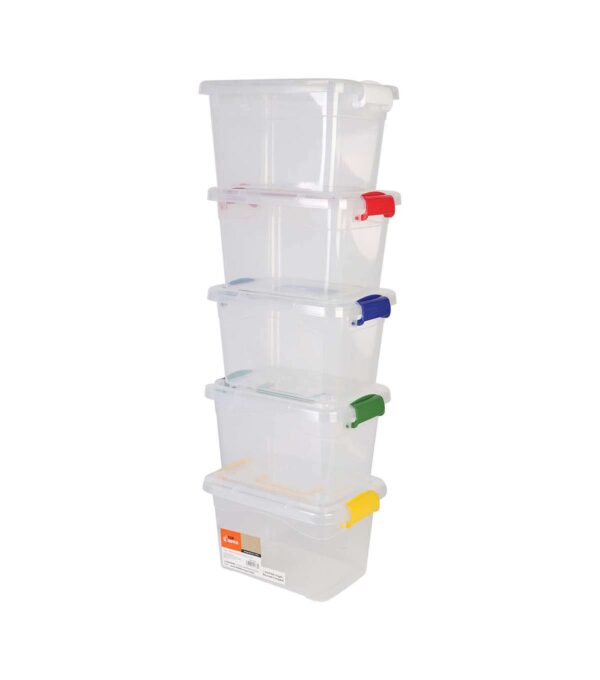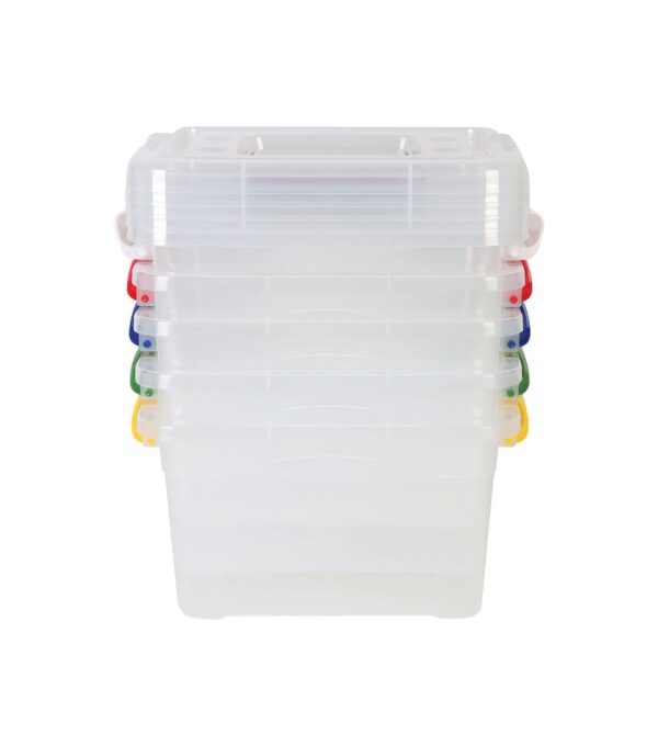 Keep your craft supplies, newspapers, books, and more organized with the Top Notch Storage Box Set. This pack includes five clear latching plastic storage bins with a handle for ease of carrying. The latch closures ensure that your items stay secure and protected. The bins come in five assorted colors, so you can easily color-code your supplies.