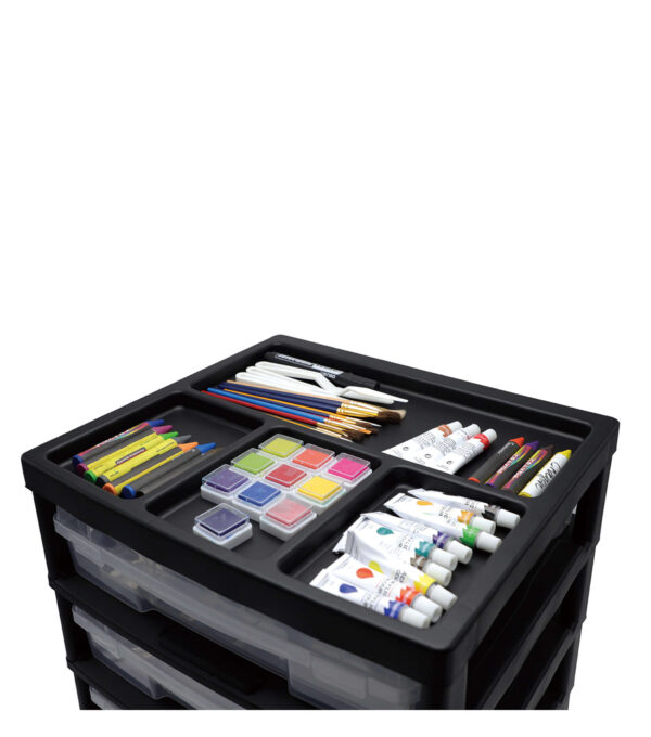 The Black 6 Case Rolling Storage Cart by Top Notch will keep your kid’s craft supplies organized. This tiered, rolling storage cart is designed with a slotted tray on top. It comes with six lidded cases that you can use to keep paints, paintbrushes and stationery safe and away from dust. You can also use the cases to store beads, jewelry findings, embellishments, charms and more.