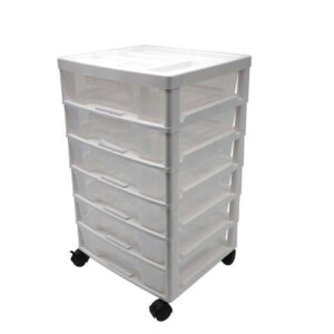 Keep your craft supplies organized and the craft room tidy with the White 6 Drawer Rolling Storage Cart by Top Notch. This storage cart is designed with wheels for easy mobility. It comes with six drawers and a divided organizer tray at the top. You can also use it in the office to keep stationery, mail, files and more.