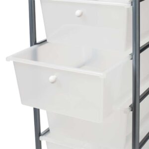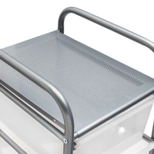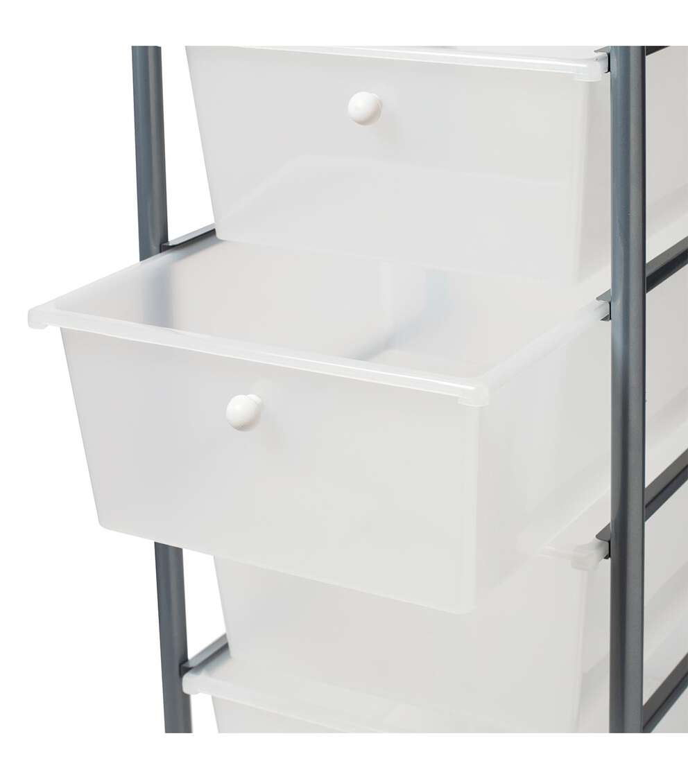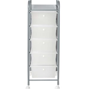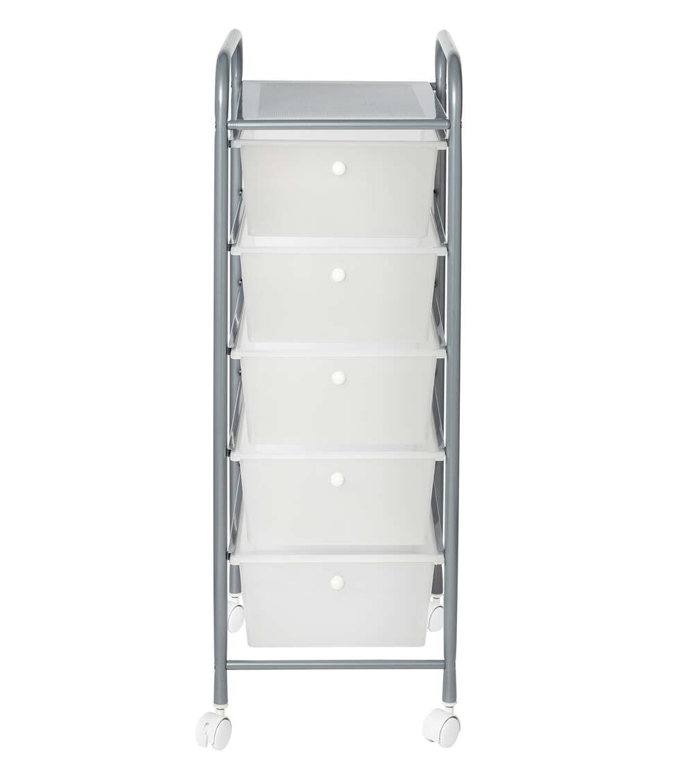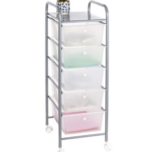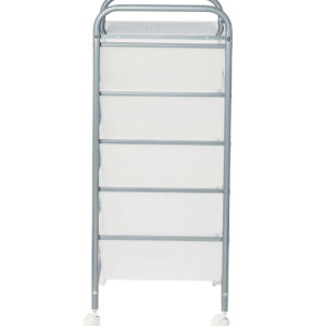 It can be challenging to keep a craft area organized while your creative juices are flowing and you are surrounded by endless supplies. This 5-drawer craft cart brings it all home with spacious drawers for convenient storage and a tabletop work space for your project or to store larger items on. Wheels keep the cart on the move with you, and they also lock for stability. So whether you’re a beginner or an aficionado, this cart is the perfect crafting companion.The ideal storage solution for all your arts & crafts.Clear plastic drawers provide easy access to supplies.Tabletop surface for extra work space or cricket .Locking wheels for extra stability while crafting.Dimensions: 14″W x 37″H x 15″D.CRTN09175