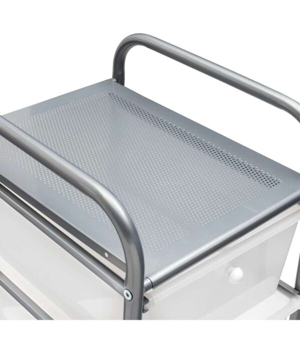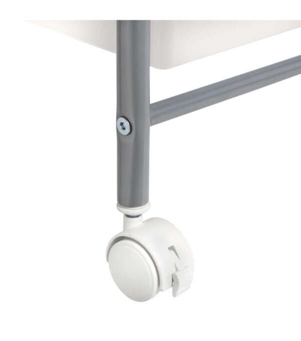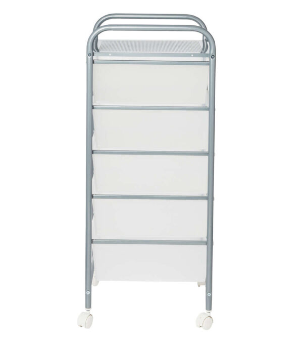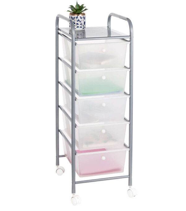 It can be challenging to keep a craft area organized while your creative juices are flowing and you are surrounded by endless supplies. This 5-drawer craft cart brings it all home with spacious drawers for convenient storage and a tabletop work space for your project or to store larger items on. Wheels keep the cart on the move with you, and they also lock for stability. So whether you’re a beginner or an aficionado, this cart is the perfect crafting companion.The ideal storage solution for all your arts & crafts.Clear plastic drawers provide easy access to supplies.Tabletop surface for extra work space or cricket .Locking wheels for extra stability while crafting.Dimensions: 14″W x 37″H x 15″D.CRTN09175
