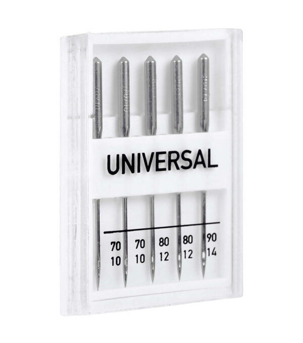 - Top Notch Universal Machine Needles in Assorted Sizes are a set of 5 sewing machine needles for use with most woven and knit fabrics. Coated with durable nickel-plated steel, these all-purpose machine needles are universal, meaning they are compatible with most household domestic sewing machine. Select the needle size based on the type and weight of your fabric. The set includes two size 70/10 needles designed for use with very sheer or lightweight fabrics, two 80/12 needles for lightweight fabrics, and one 90/14 needle for use with medium weight fabrics. Crafted from durable, nickel-plated steel, these strong sewing machine needles are built to last. For safety, keep these and all needles away from children. The set comes in a transparent compact case that shows the sizes marked on its cover so you can keep your needles neat and organized. This versatile machine needle set is the perfect starter set for your sewing machine supplies kit.