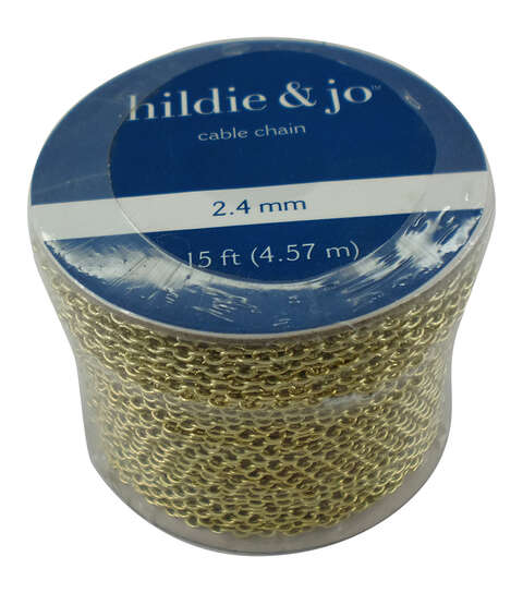 Add a customized touch to your jewelry and necklace or bracelet collections with this hildie & jo Small Link Iron Cable Chain-Gold. Add hildie & jo cord, findings, charms and beads for a beautiful, one-of-a-kind look. The chain is 5.2 mm wide and 15 feet long.