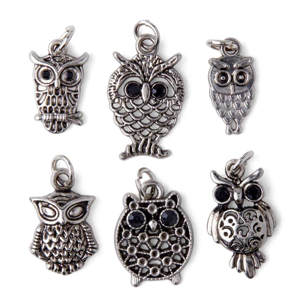 Personalize a DIY jewelry or craft project using these unique hildie & jo Symbolize Owl Charms-Silver. This pack includes six charms, all in the shape of owls. Each owl is unique and has different eyes, body types and detailing. These charms have jump rings for easy attachment.
