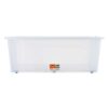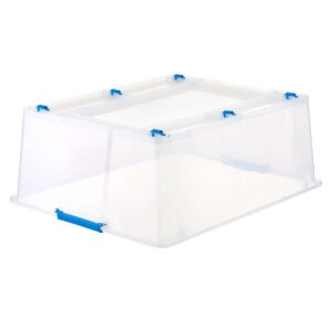The Plastic Storage Box with Snap Lid will make a great addition to your organizing supplies. This clear storage container comes with a lid with a snap closure and will keep the contents safe and intact. You can use it to store bedsheets, clothes, games, toys and more. It is designed with wheels for easy portability.