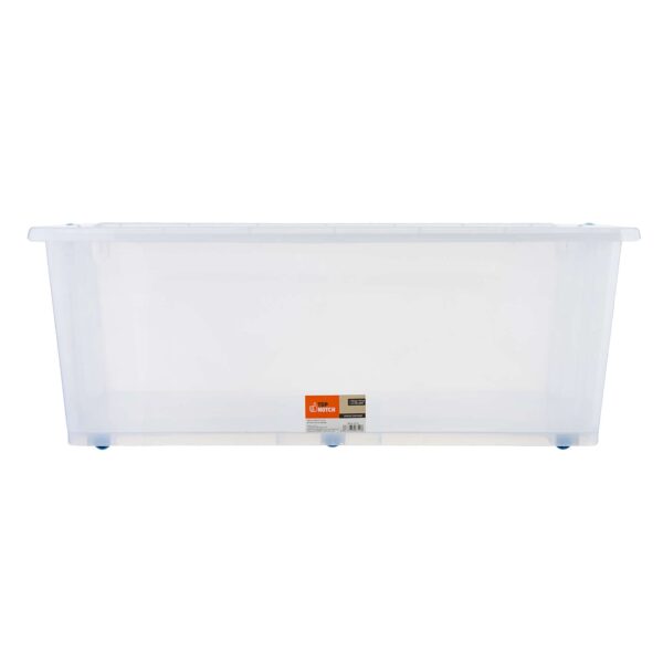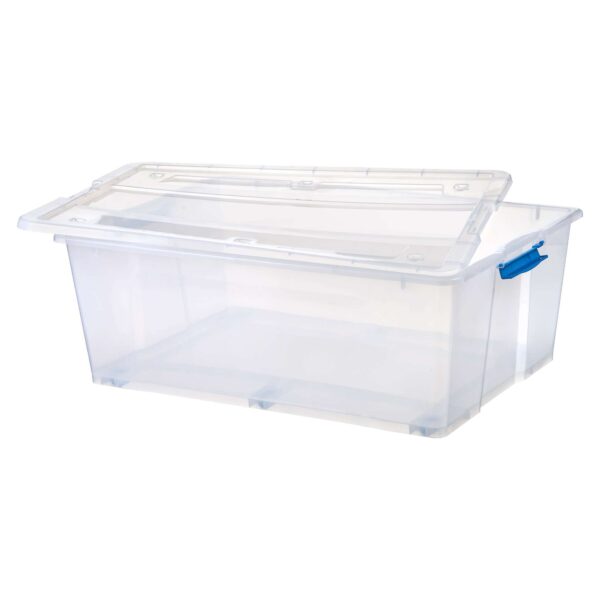 The Plastic Storage Box with Snap Lid will make a great addition to your organizing supplies. This clear storage container comes with a lid with a snap closure and will keep the contents safe and intact. You can use it to store bedsheets, clothes, games, toys and more. It is designed with wheels for easy portability.