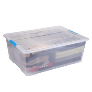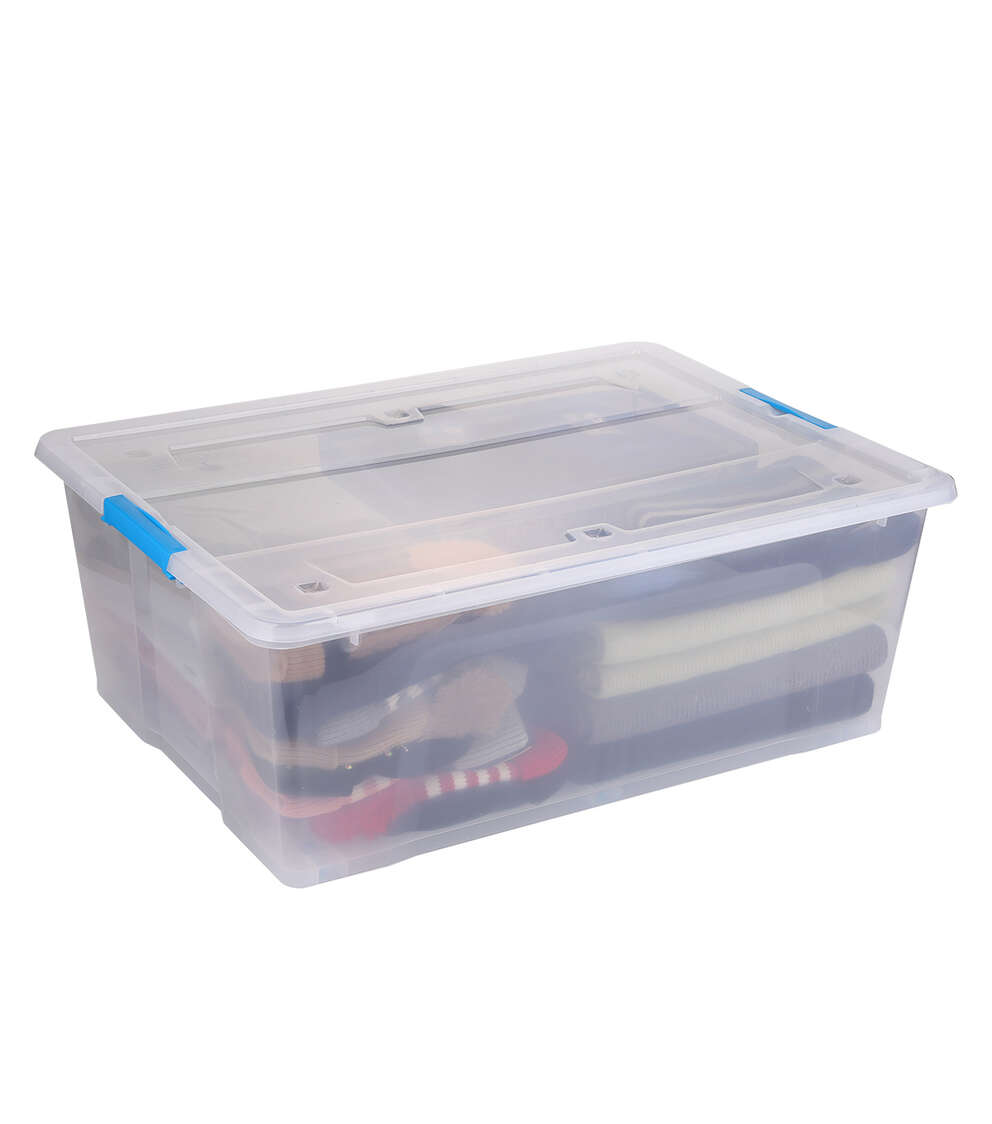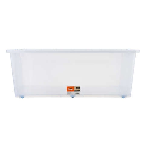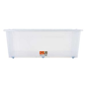The Plastic Storage Box with Snap Lid will make a great addition to your organizing supplies. This clear storage container comes with a lid with a snap closure and will keep the contents safe and intact. You can use it to store bedsheets, clothes, games, toys and more. It is designed with wheels for easy portability.
