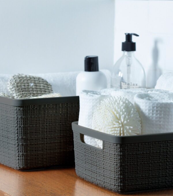 Set of multifunctional storage baskets with a natural woven look and feel that perfectly complements any home or office decor. Sturdy and versatile, they are the perfect solution for organizing items such as hand towels in the bathroom, magazines or remotes in the family room. The Curver Jute Basket is even handy in the kitchen, providing chic pantry storage. The various sizes are designed to fit all spaces. Cutout handles makes them especially easy to carry and remove from shelves.