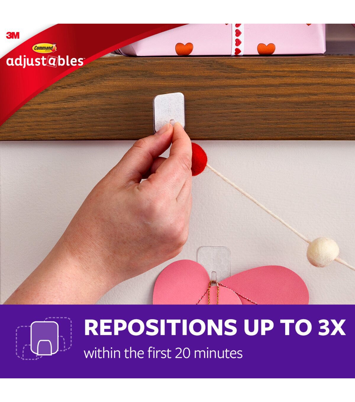 Perfect is now possible with Command Adjustables Products, a new line of hooks and clips that you can reposition up to three times within the first 20 minutes. Leveraging new peelable technology, these hooks and clips are easy to use and hold strongly on a variety of surfaces, including painted walls, wood, tile and more. Yet, they come off cleanly by just peeling – no holes, no marks. Now you have three chances to make a great first impression.