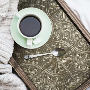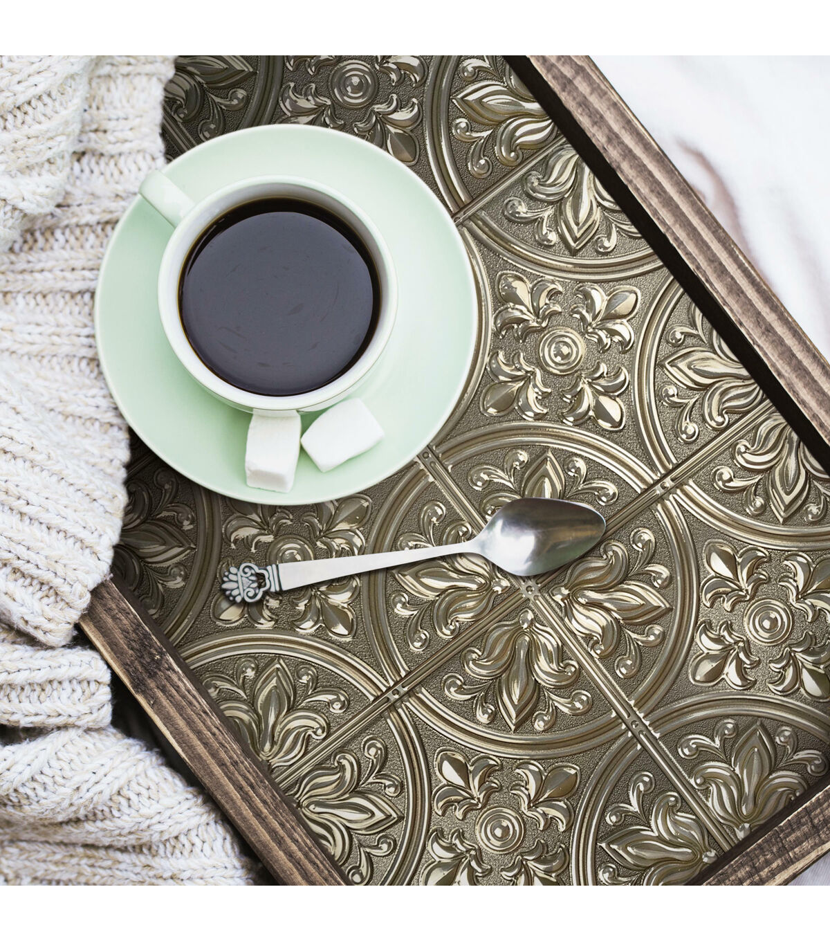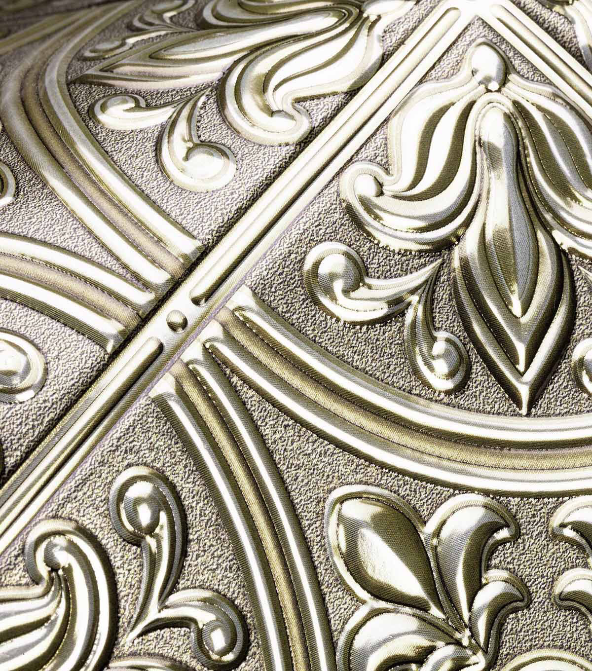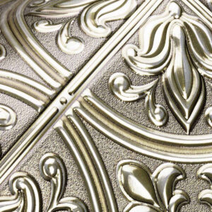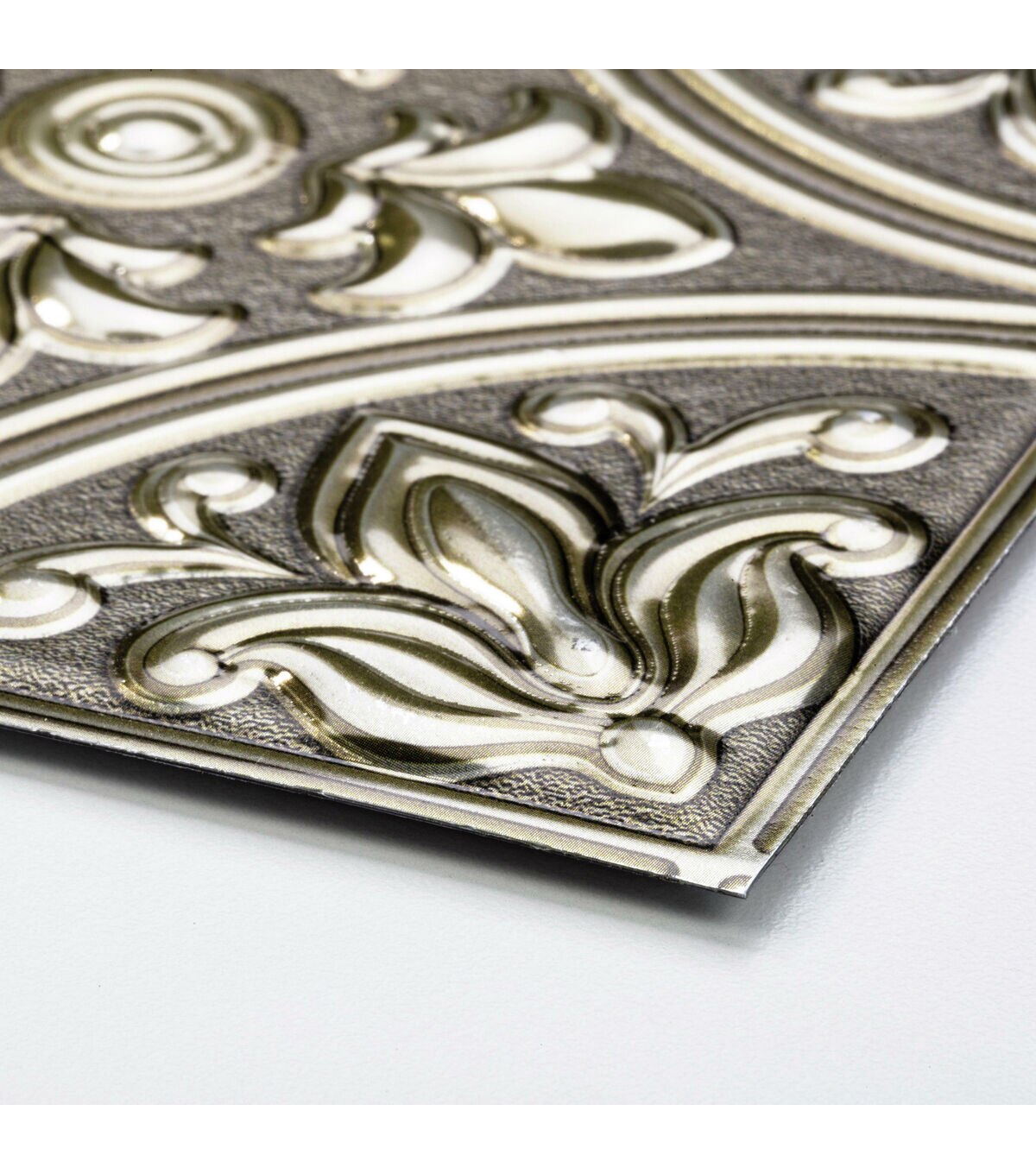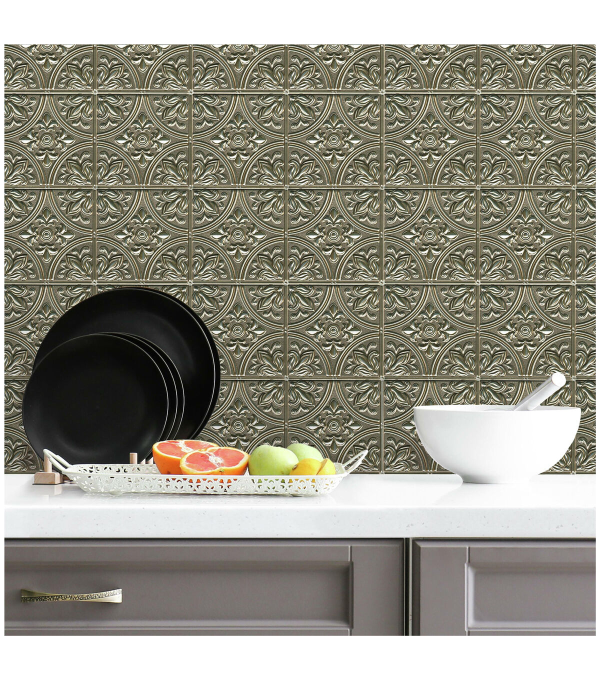 The classic beauty of Victorian tin tiles is interpreted into easy and affordable current design with these Gold Tin Peel and Stick StickTiles from RoomMates. Designed to imitate the exquisite ceiling plasterwork of grand European homes, faux pressed tin designs are now fashionably used for art-work, back splashes, cabinet faces, wainscoting and more.  The 3D/embossed design elements within the tile capture timeless motifs like the fleur de lis, acanthus scrolls, medallions and architectural gridwork.  Burnished metal finish with a wash of soft gold make these StickTiles the perfect accompaniment to any home décor with metal accents.  RoomMates StickTiles are easy to clean and are the go-to solution for do-it-yourself easy and affordable décor installed with regular household tools, helping you decorate in minutes.  Just peel and stick! 4 Tiles 10.5 inch x 10.5 inch     3.07 sq. ft.