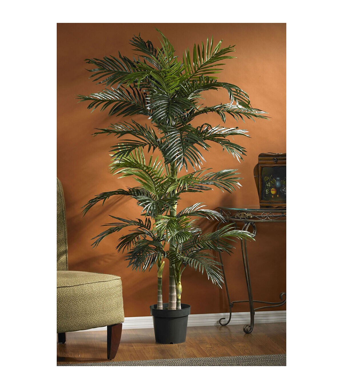 One of the finest silk palm trees we offer, this six and a half foot Golden Kane Palm tree will have you feeling like you are always on vacation. Standing a full 78″ high, the multiple trunks sport 333 palm leaves, just waiting to dance in the warm tropical breezes. Perfect for any room or office d”cor, this majestic palm tree will create a sunny atmosphere wherever you place it.Silk floral arrangements are manufactured using synthetic materials and are well designed and constructed to be life-like in appearance.