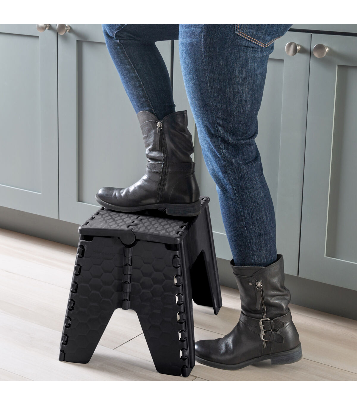 A must have in any home, dorm or office, the Simplify 12″ Folding Step Stool. With an easy carry handle you can conveniently transport the stool to any room in the household. With the 12 inch height and weight capacity up to 300lbs, this stool can hold children and adults. The anti-skid foot pads keeps this item safe to use. When not in use the stool easily folds away for storage.