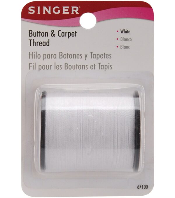 The Singer Button & Carpet Thread 50Yds is an extra-strong thread for heavy fabrics. Thicker than most all-purpose threads, this button and carpet thread is ideal for sewing buttons or carpets. You can also use this thread to sew backpacks, fabric based outdoor equipments and more. 100% colorfast and washable, this thread is available in two colors black and white. This pack contains 50 yards of button and carpet thread in a spool.