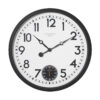 The Terrace 29-inch Wall Clock offers a dapper, black resin frame with a crisp, contrasting, white face. Perfectly sized for a kitchen or living room, this timepiece will be the centerpiece of your room’s wall. The unique black subdial at the bottom of the face tracks the seconds for you, replacing the traditional second hand used on other clocks. Large Arabic numerals are easy to read from a distance. The accurate quartz movement, glass lens, and simple design make it perfect for a lobby or lunchroom as well. Requires two AA alkaline batteries (not included).