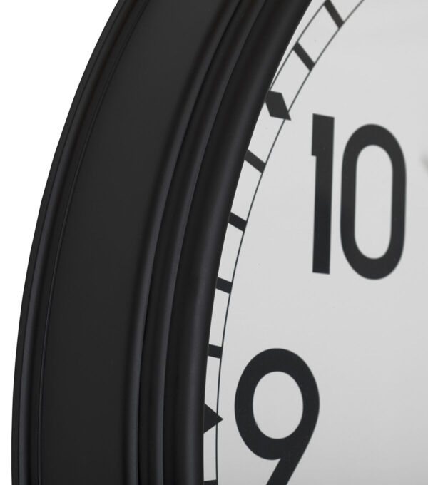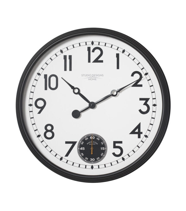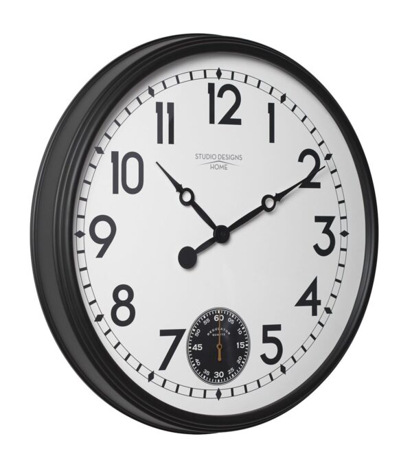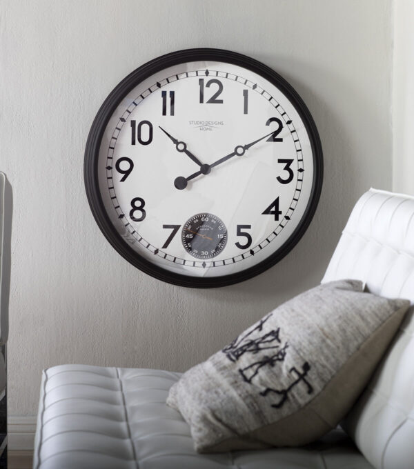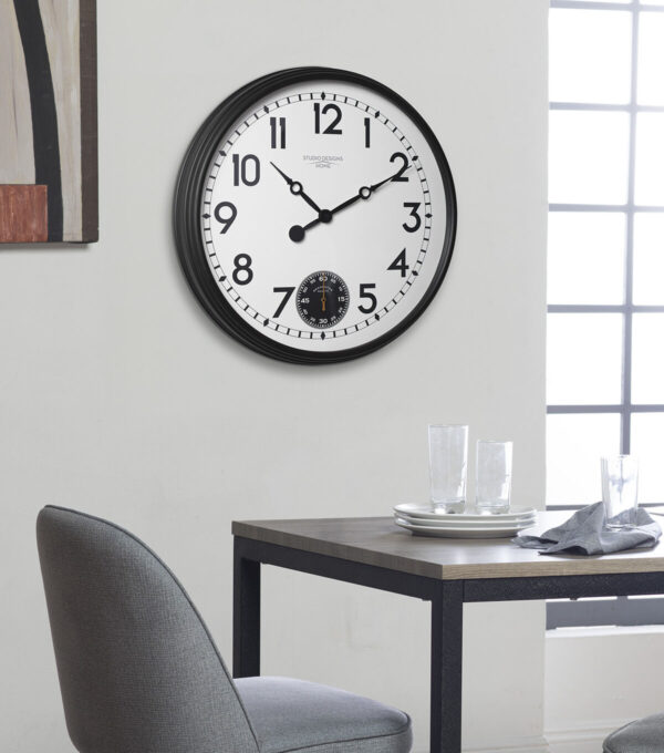 The Terrace 29-inch Wall Clock offers a dapper, black resin frame with a crisp, contrasting, white face. Perfectly sized for a kitchen or living room, this timepiece will be the centerpiece of your room’s wall. The unique black subdial at the bottom of the face tracks the seconds for you, replacing the traditional second hand used on other clocks. Large Arabic numerals are easy to read from a distance. The accurate quartz movement, glass lens, and simple design make it perfect for a lobby or lunchroom as well. Requires two AA alkaline batteries (not included).