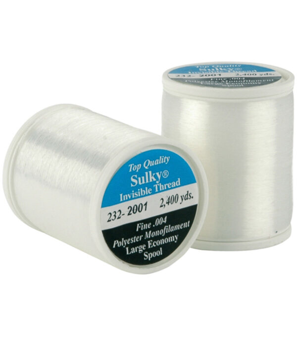 Sulky Premium Invisible Thread is a very fine .004 polyester monofilament that is soft enough for baby quilts or garments that will be worn next to the skin. It is much more heat tolerant than nylon; it will not melt with normal ironing through the cotton setting. It is perfect for machine “hand-look” quilting, stitching in the ditch, invisible appliqu”, and hems. Choose smoke for darker fabrics and clear for lighter fabrics. This is the size for you if this is your go-to thread for machine appliqu” and quilting. Works well in the bobbin.