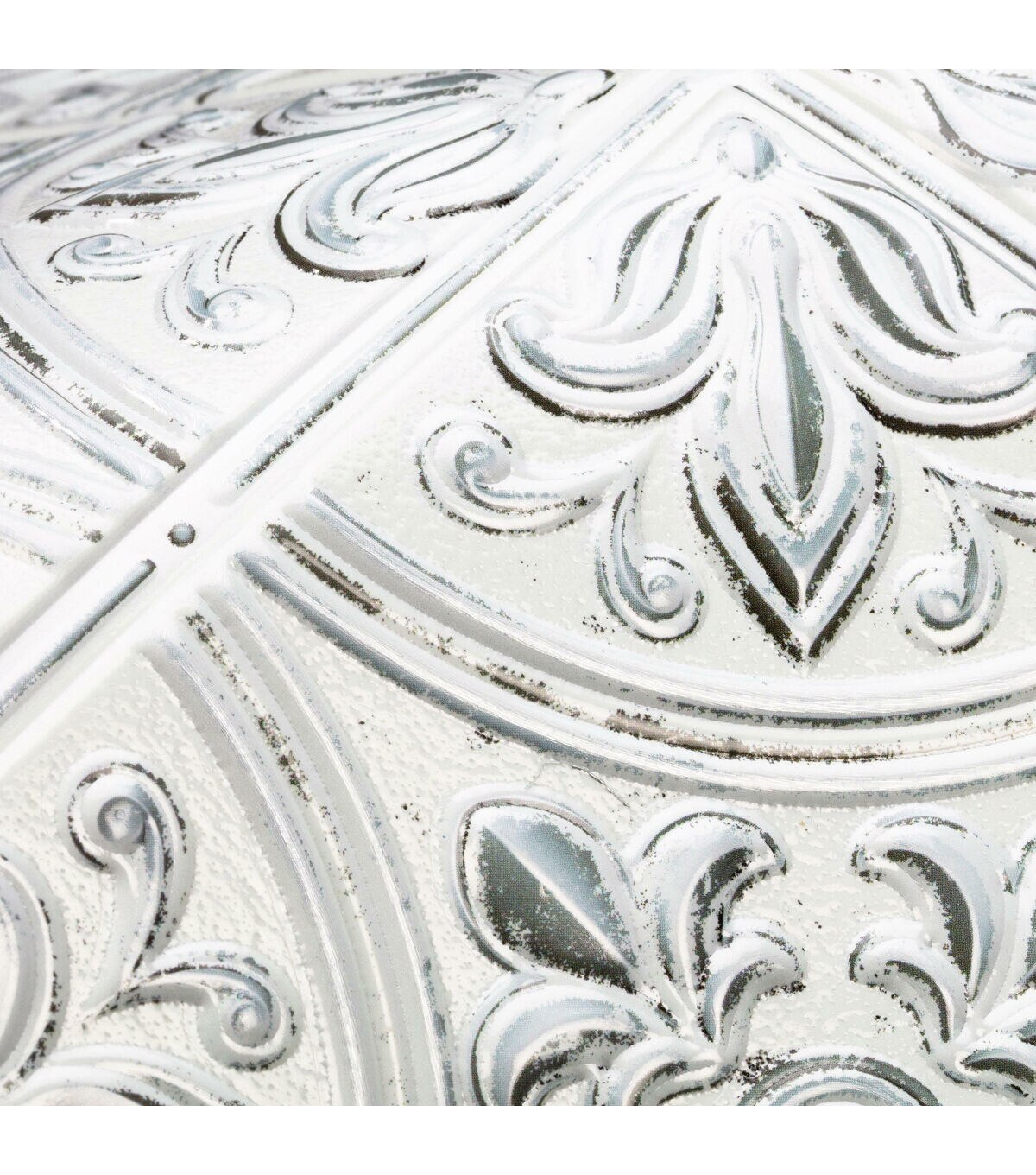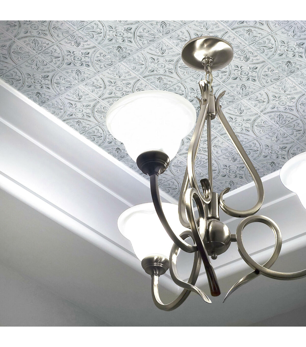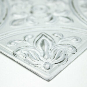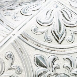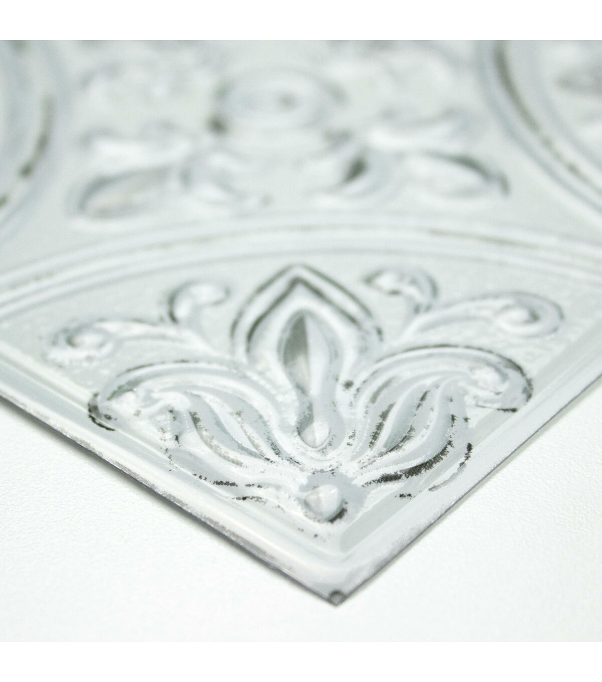 The classic beauty of Victorian tin tiles is interpreted into easy and affordable current design with these White Tin Peel and Stick StickTiles from RoomMates. Originally designed to imitate the exquisite ceiling plasterwork of grand European homes, faux pressed tin designs are now fashionably used for art-work, back splashes, cabinet faces, wainscoting and more. The 3D/embossed design elements within the tile capture timeless motifs like the fleur de lis, acanthus scrolls, medallions and architectural gridwork. Soft white matt finish with a rubbed effect that hints at silver metal beneath makes these StickTiles the perfect accompaniment to any home décor. RoomMates StickTiles are easy to clean and are the go-to solution for do-it-yourself easy and affordable décor installed with regular household tools, helping you decorate in minutes. 4 Tiles 10.5 inch x 10.5 inch