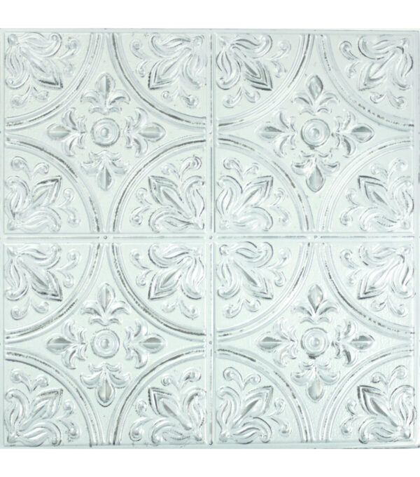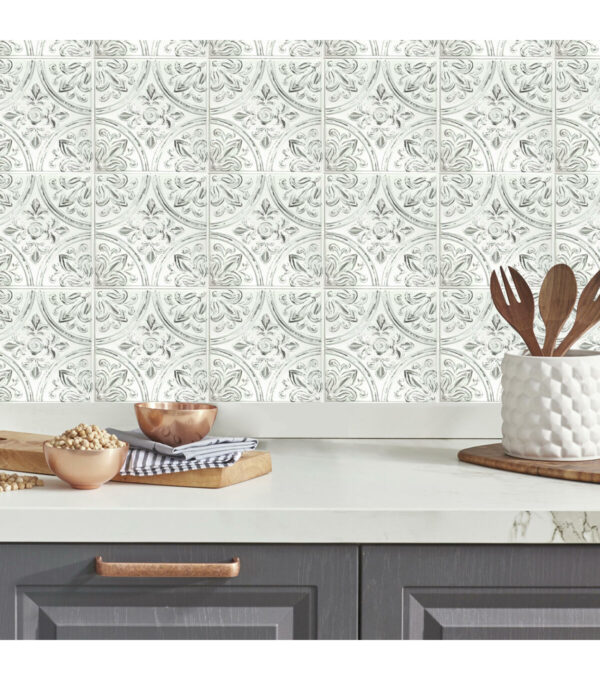The classic beauty of Victorian tin tiles is interpreted into easy and affordable current design with these White Tin Peel and Stick StickTiles from RoomMates. Originally designed to imitate the exquisite ceiling plasterwork of grand European homes, faux pressed tin designs are now fashionably used for art-work, back splashes, cabinet faces, wainscoting and more. The 3D/embossed design elements within the tile capture timeless motifs like the fleur de lis, acanthus scrolls, medallions and architectural gridwork. Soft white matt finish with a rubbed effect that hints at silver metal beneath makes these StickTiles the perfect accompaniment to any home décor. RoomMates StickTiles are easy to clean and are the go-to solution for do-it-yourself easy and affordable décor installed with regular household tools, helping you decorate in minutes. 4 Tiles 10.5 inch x 10.5 inch