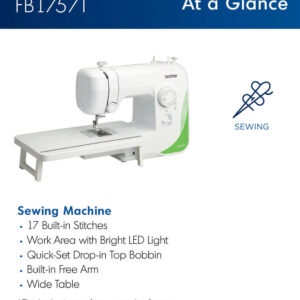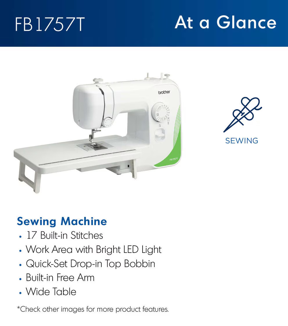 The FB1757T handles basic sewing and mending and is easy to use. Built-in are 17 unique utility and decorative stitches and an included 4-step buttonholer. This model also features a jam-resistant drop-in top bobbin and a brightly lit LED work area.