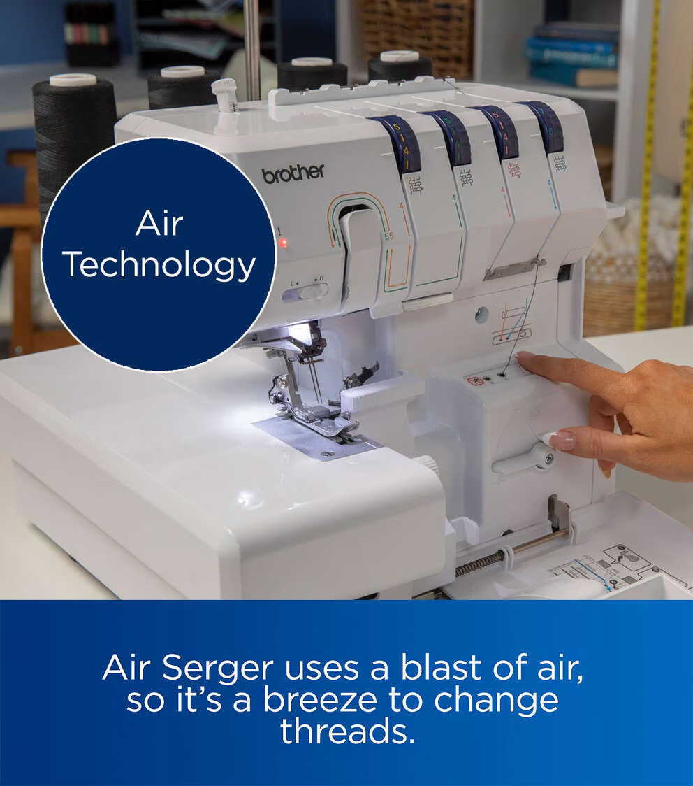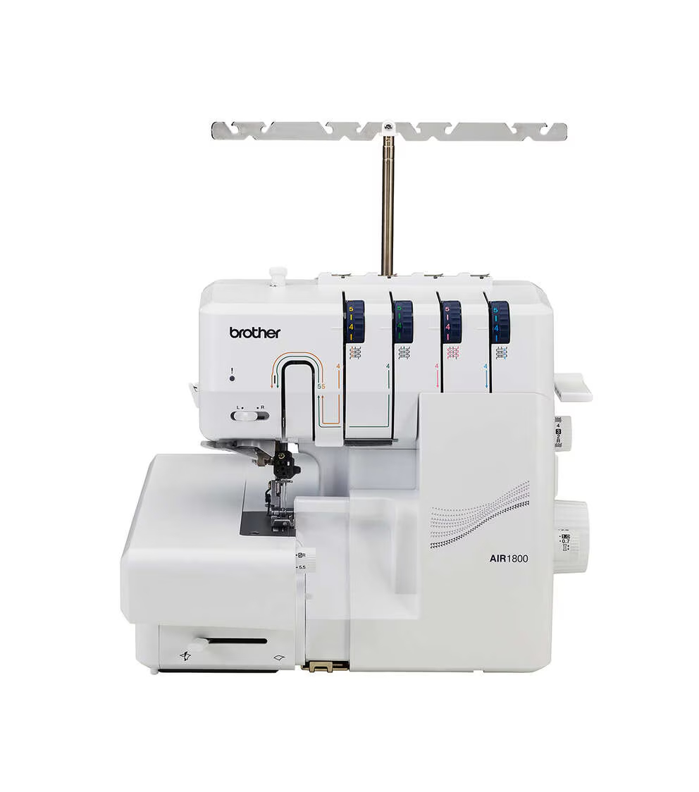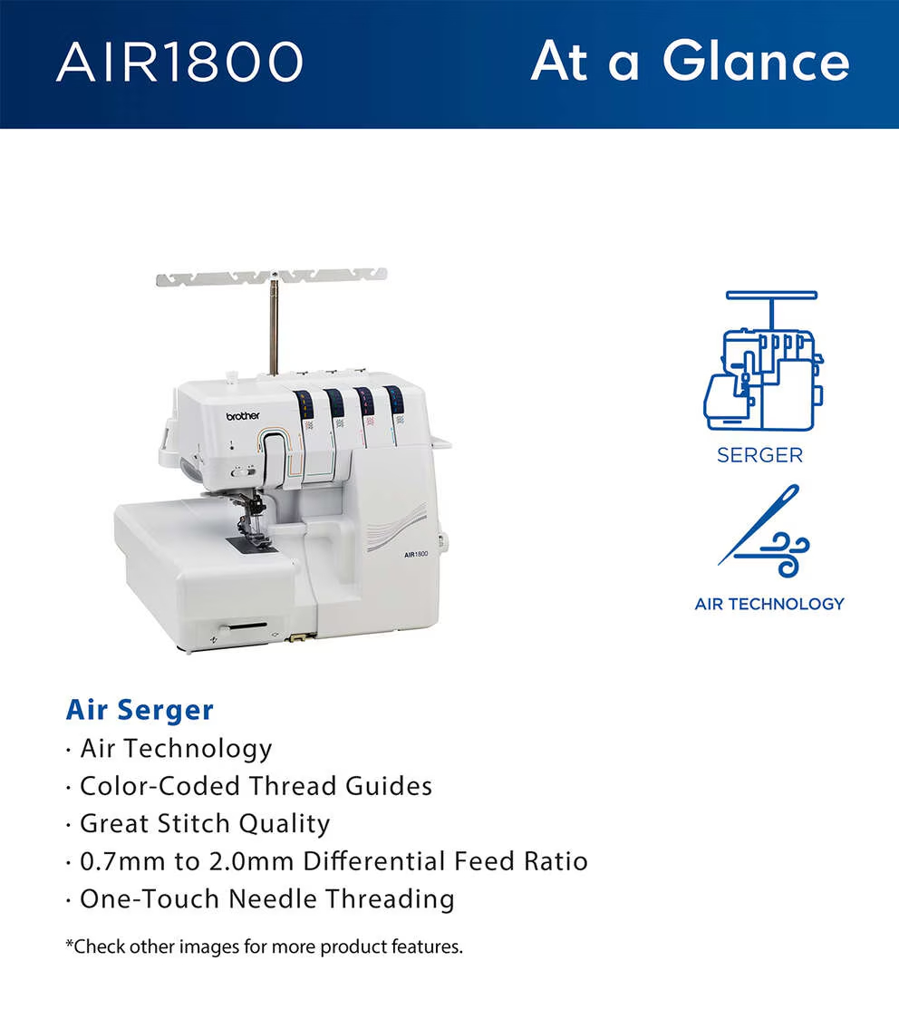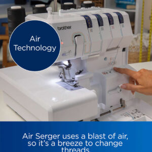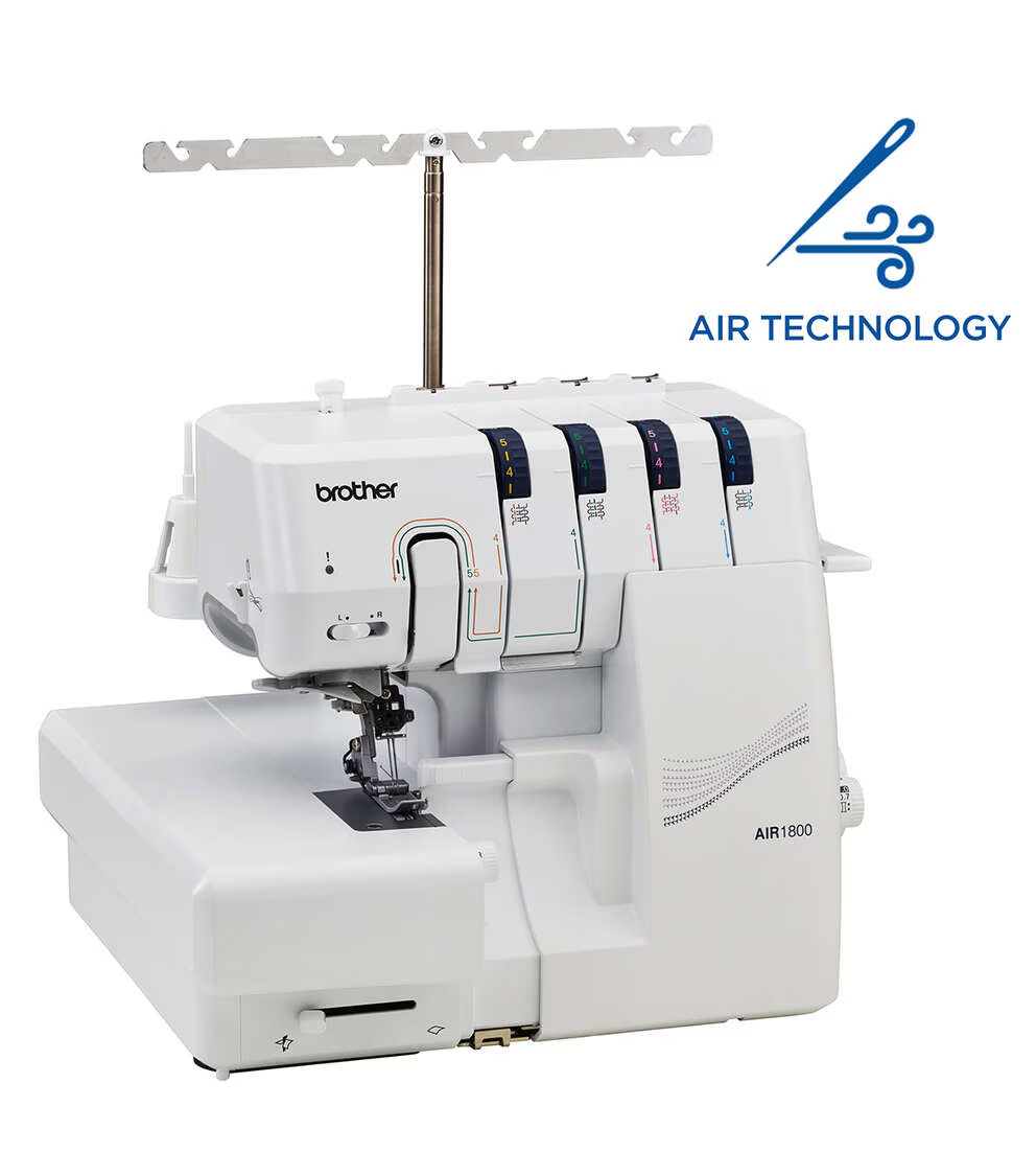 - Air Technology: Thread the AIR1800 with a blast of air. With threading ports that are connected to the end of each looper by tubes, at the press of a button, a gust of air sends the threads through the looper, so, it’s a breeze to change thread colors.