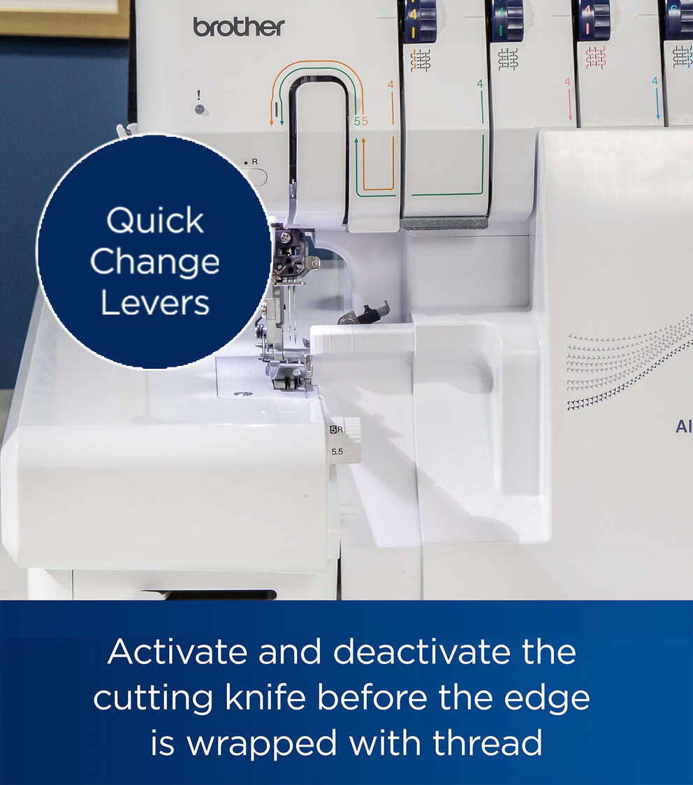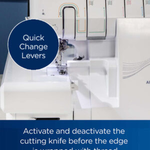 - Quick Change Levers: The AIR1800 has pair of quick-change levers for the rolled hemstitch feature, and a switch that will activate and deactivate the cutting knife before the edge is wrapped with thread. (serged).