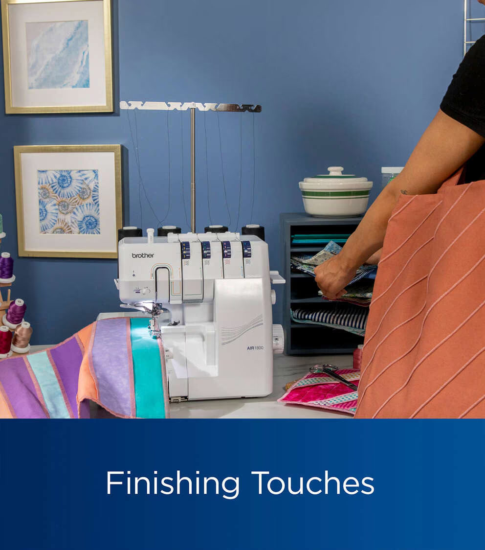 You’ll be walking on air with the technologically advanced AIR1800 Air Serger. The AIR1800 Air Serger is a versatile, durable serger and a must-have for any sewing room. A new technology that is air driven, the AIR1800 makes changing threads a breeze. How does this work? The threading ports are connected to the end of each looper by tubes, and at the touch of a button, a blast of air sends the threads through the loopers, so it’s a cinch to change thread colors. The modernistic AIR1800 is more efficient than a traditional sewing machine as it can cut and finish seams all in one pass. The AIR1800 precisely loops the stitch and gives you a nice, smooth edge. Plus, it uses multiple threads and can be used for both construction and finishing. While the gust of air will push the thread through the loopers, threading the needle is accessible using the convenient needle threader. Simply toggle to the left or right needle position to thread the needle and trim the excess with the built-in thread cutter. The list of convenient features on the AIR1800 starts with an error LED indicator light that will notify when the fabric cover is open or if the presser foot is raised, quick-change levers for rolled hemstitch, and a switch that will activate and deactivate the cutting knife. The brightly lit LED work area is easy on the eyes when sewing on dark fabrics, while the useful Adjustable Stitch feature allows the width and length of the stitch to be set for your project. The AIR1800 Air serger is excellent for challenging fabrics such as fine knits and stretchy materials. In addition, the Differential Feed Ratio (0.7mm to 2.0mm) on the AIR1800 provides outstanding stitch quality and acts as the tool for custom lettuce edge finishes on specialty fabrics. And thanks to the cutting-edge technology utilized in the AIR1800, you’ll be able to do up to 1,300 stitches per minute and make clean edges and seams. The AIR1800 makes adding decorative stitches to homemade garments a snap. The noise level on the AIR1800 is moderate, making it great for adding a decorative touch to any garment anytime. The color-coded thread guides make staying organized and in control a breeze, allowing you to handle two, three, or even four threads simultaneously with one or two needles. Use the easy one-touch needle threading for two needles to get started the moment inspiration strikes, and with the large optional extension table1 with storage means there’s no project too big for you to tackle. The AIR1800 is ideal for advanced sewers who are already using a serger but are looking to upgrade or for serger beginners using sewing machines for garment construction, home decor, crafting, and quilting but are looking to add decorative finishes to their projects. When it comes time to add professional touches to your next project, you’ll be walking on air with the AIR1800 Air Serger.