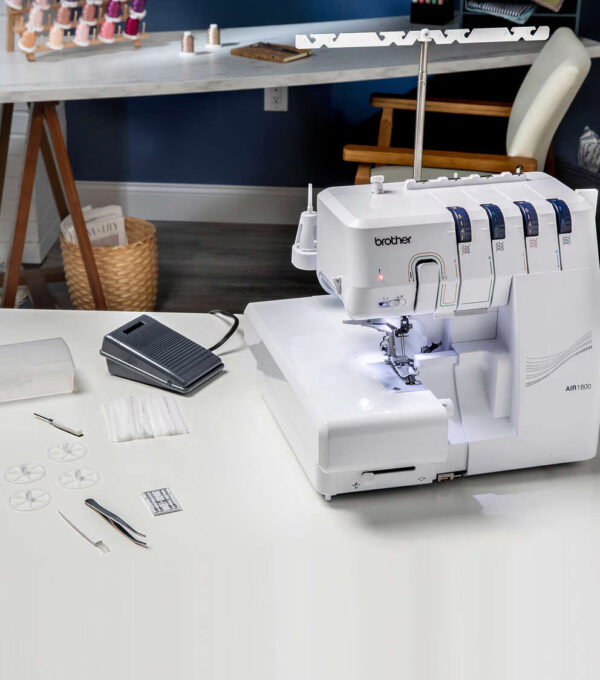 You’ll be walking on air with the technologically advanced AIR1800 Air Serger. The AIR1800 Air Serger is a versatile, durable serger and a must-have for any sewing room. A new technology that is air driven, the AIR1800 makes changing threads a breeze. How does this work? The threading ports are connected to the end of each looper by tubes, and at the touch of a button, a blast of air sends the threads through the loopers, so it’s a cinch to change thread colors. The modernistic AIR1800 is more efficient than a traditional sewing machine as it can cut and finish seams all in one pass. The AIR1800 precisely loops the stitch and gives you a nice, smooth edge. Plus, it uses multiple threads and can be used for both construction and finishing. While the gust of air will push the thread through the loopers, threading the needle is accessible using the convenient needle threader. Simply toggle to the left or right needle position to thread the needle and trim the excess with the built-in thread cutter. The list of convenient features on the AIR1800 starts with an error LED indicator light that will notify when the fabric cover is open or if the presser foot is raised, quick-change levers for rolled hemstitch, and a switch that will activate and deactivate the cutting knife. The brightly lit LED work area is easy on the eyes when sewing on dark fabrics, while the useful Adjustable Stitch feature allows the width and length of the stitch to be set for your project. The AIR1800 Air serger is excellent for challenging fabrics such as fine knits and stretchy materials. In addition, the Differential Feed Ratio (0.7mm to 2.0mm) on the AIR1800 provides outstanding stitch quality and acts as the tool for custom lettuce edge finishes on specialty fabrics. And thanks to the cutting-edge technology utilized in the AIR1800, you’ll be able to do up to 1,300 stitches per minute and make clean edges and seams. The AIR1800 makes adding decorative stitches to homemade garments a snap. The noise level on the AIR1800 is moderate, making it great for adding a decorative touch to any garment anytime. The color-coded thread guides make staying organized and in control a breeze, allowing you to handle two, three, or even four threads simultaneously with one or two needles. Use the easy one-touch needle threading for two needles to get started the moment inspiration strikes, and with the large optional extension table1 with storage means there’s no project too big for you to tackle. The AIR1800 is ideal for advanced sewers who are already using a serger but are looking to upgrade or for serger beginners using sewing machines for garment construction, home decor, crafting, and quilting but are looking to add decorative finishes to their projects. When it comes time to add professional touches to your next project, you’ll be walking on air with the AIR1800 Air Serger.