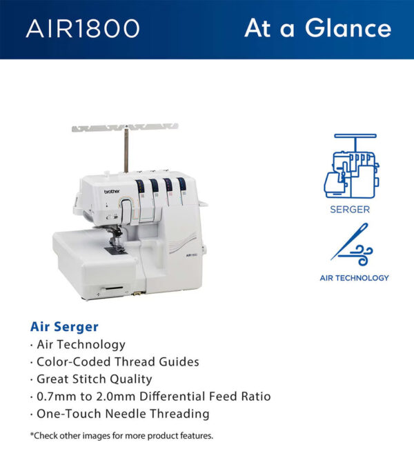 - Air Technology: Thread the AIR1800 with a blast of air. With threading ports that are connected to the end of each looper by tubes, at the press of a button, a gust of air sends the threads through the looper, so, it’s a breeze to change thread colors.