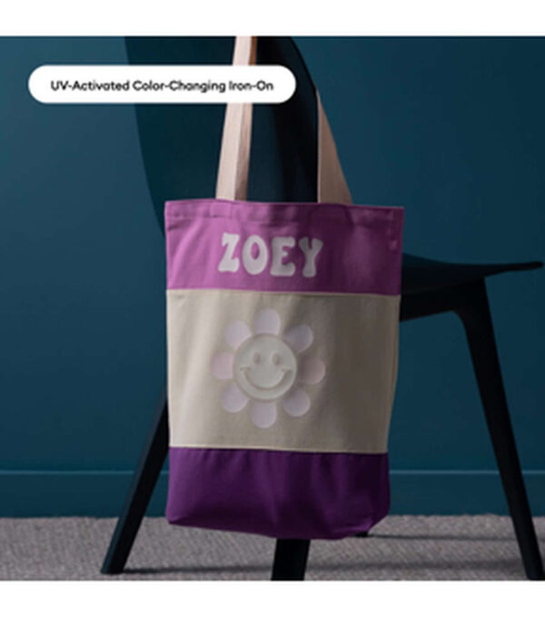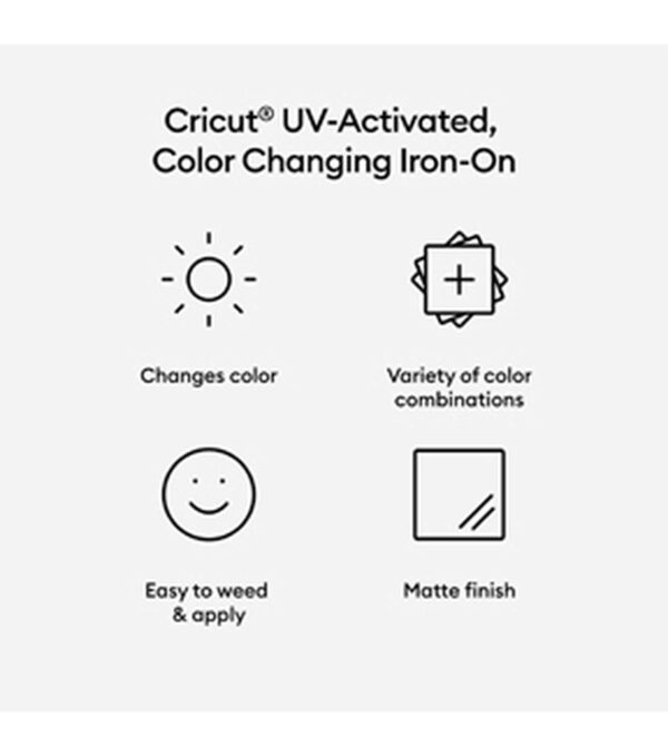 Let the sun transform your designs with Cricut UV-Activated, Color-Changing Iron-On. This marvelous material changes color when exposed to sunlight, making it ideal for apparel, accessories, and outdoor decor. With Cricut Iron-On, intricate designs are simple to cut with your Cricut machine, and you’ll weed with ease to prep for flawless application. Fun phrases and delightful designs are all just a cut and a press away. For use with all Cricut cutting machines. For best results, transfer using Cricut EasyPress. Care Instructions Apply to pre-washed and fully dried materials only. Allow 24 hours after application before washing. Machine wash cold inside out, tumble dry low. Do not bleach. If you need to iron, only iron on the backside of the garment.