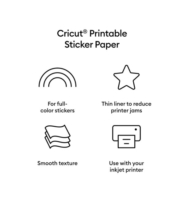 Personalize the world around you with Cricut Printable Sticker Paper. Made to simplify your sticker-making, this amazing material works with your home inkjet printer to print, then cut full-color sticker designs. Decorate notebooks, reward homework assignments, and make custom gift tags. Just create your design and print it, then your Cricut cutting machine automatically recognizes & precision-cuts the shapes for the custom stickers of your dreams. Features a thin liner to reduce printer jams. For best results, remove printer paper from printer tray. Then, load and print only one sheet of Cricut Sticker Paper at a time.