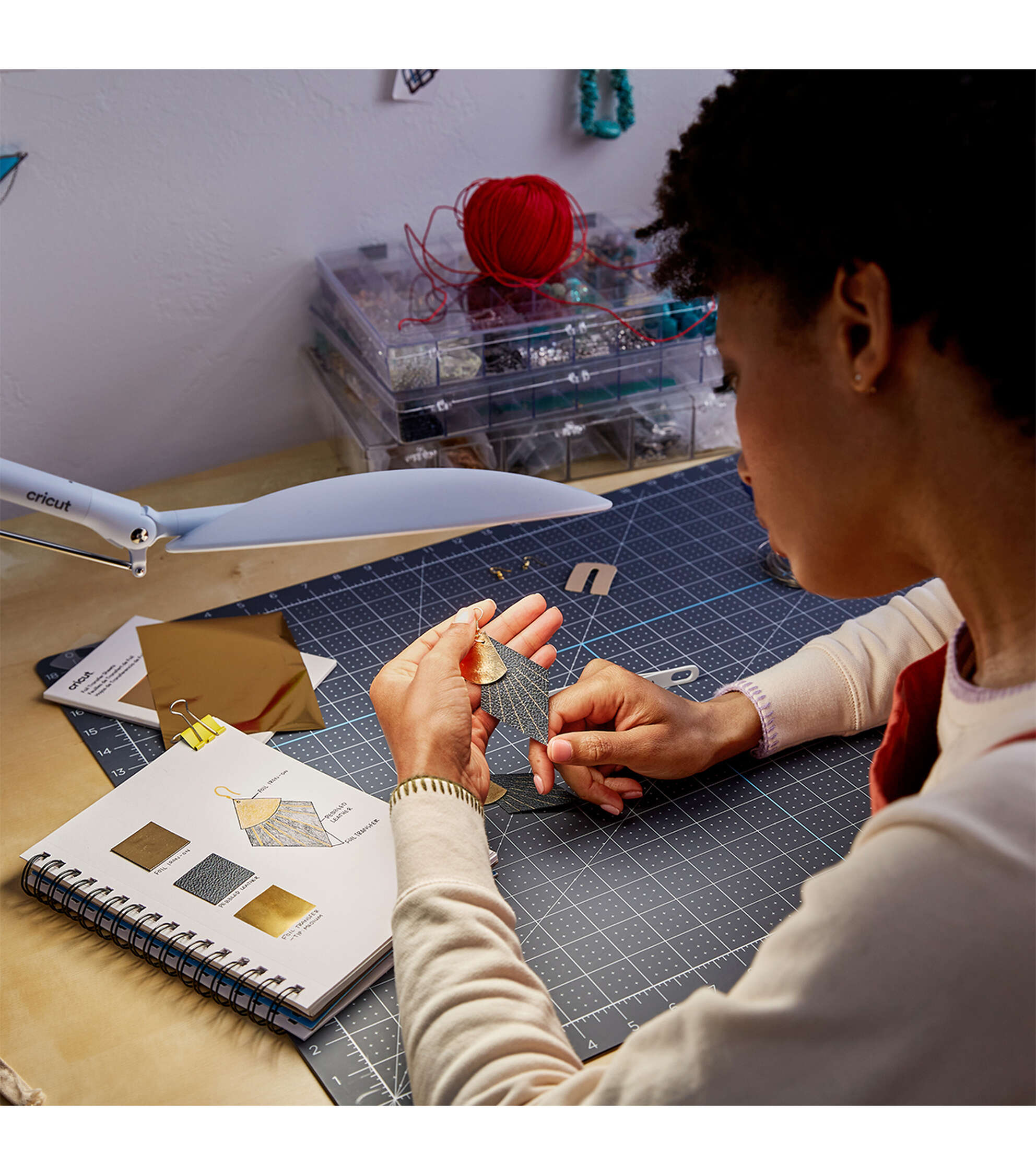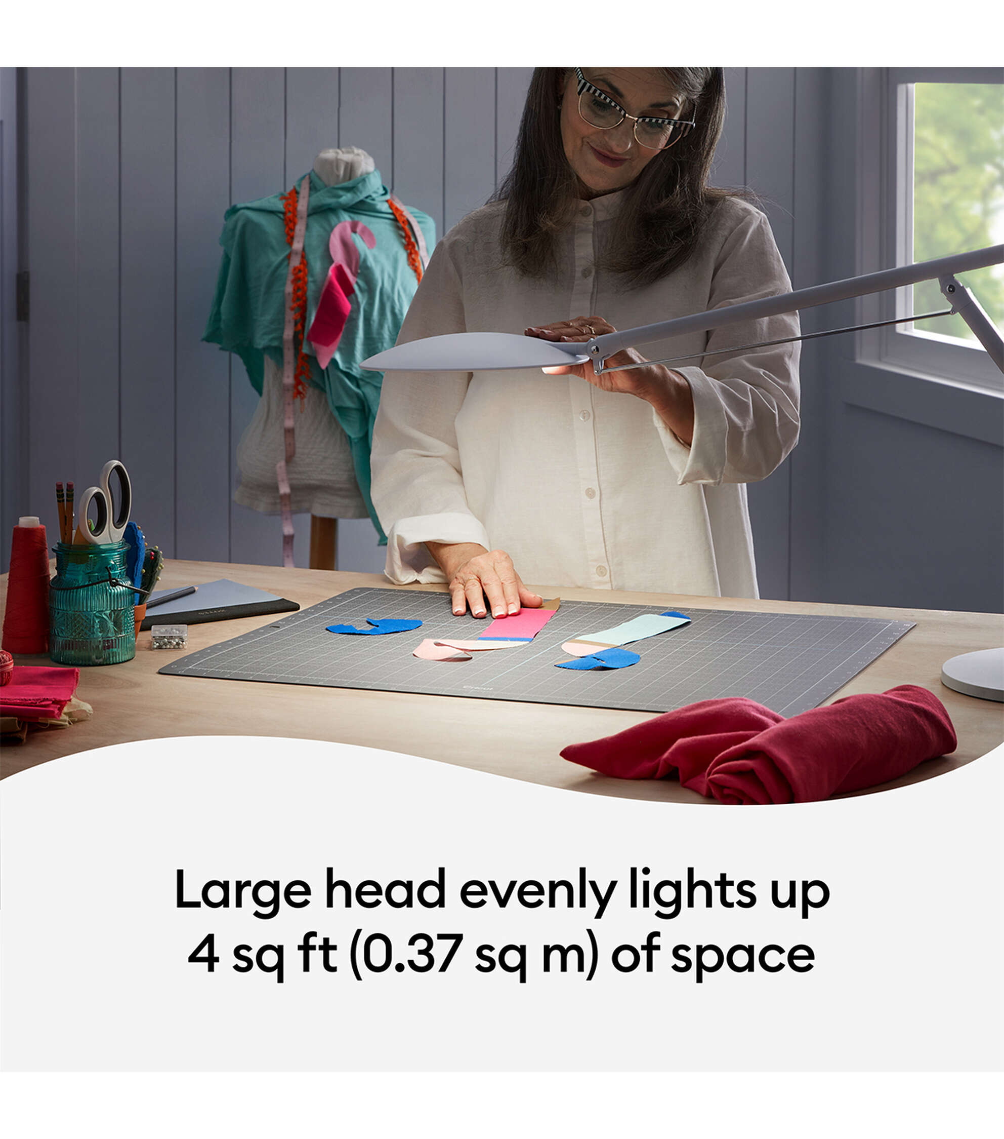 See your projects in a whole new light with Cricut Bright 360, the ultimate LED floor lamp. Its large, broad head evenly lights up your entire workspace. With a gentle push of the hand, the lamp pivots, rotates, and easily glides into the just-right position for every craft. Whether you’re working on a delicate accent piece or searching for the perfect matching shade, you’ll see colors and details with exceptional clarity. A high 95 CRI (Color Rendering Index) means your colors will appear more accurately than with a traditional bulb. Use the sleek sliders to adjust brightness (up to 3000 lux) as well as light color temperature (warm to cool white) to cast ideal light in any space. Comfortably see every detail with less glare, hotspots, and eye strain. From mid-craft to final project photos, Cricut Bright 360 shines light your way.