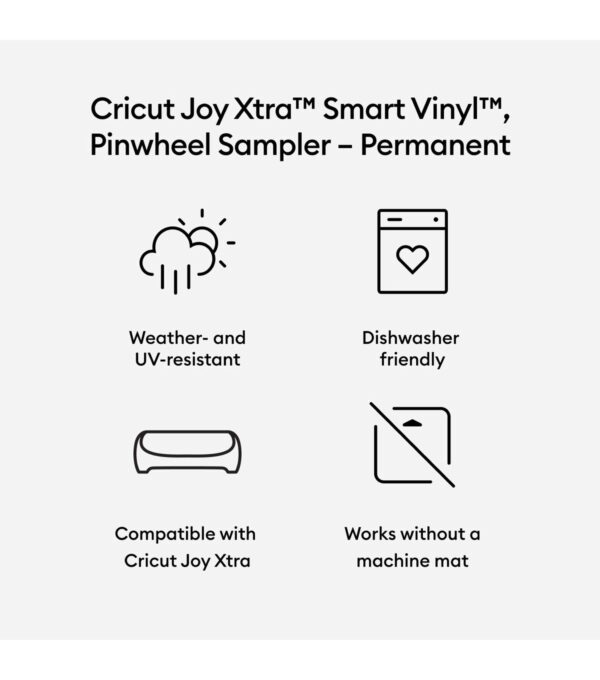 Creating personalized projects, big or small, is a snap with Smart Vinyl. This nifty material lets you make more in less time, no machine mat needed – just load and go. Cut a quick decal for your water bottle, lettering for a school project, or create a bold banner in minutes. This vinyl is weather-resistant, so it’ll last even in the great outdoors. For use with Cricut Joy Xtra. *Not intended for food or mouth contact. Carefully follow instructions at cricut.com/help/dishwasher-friendly