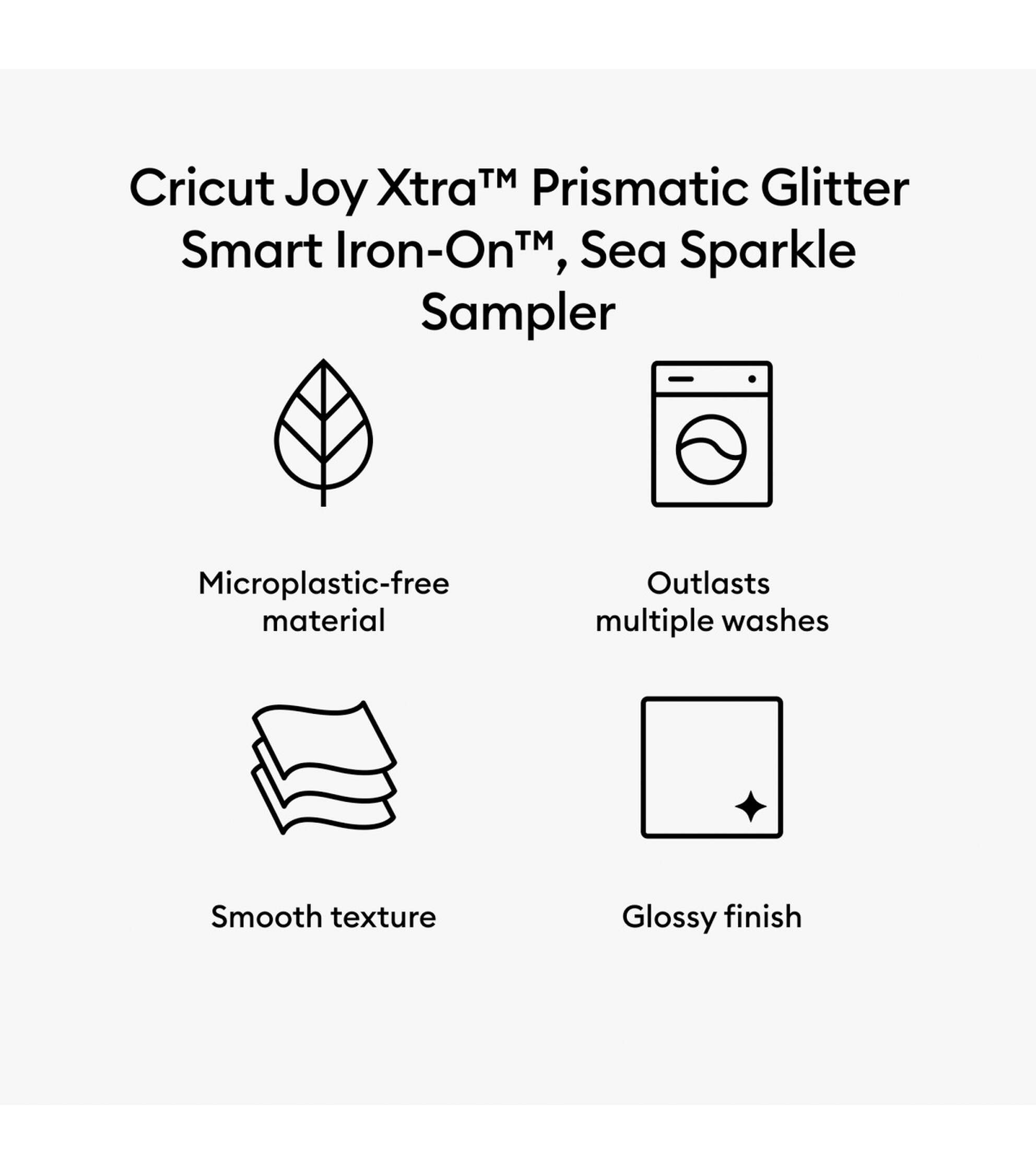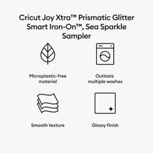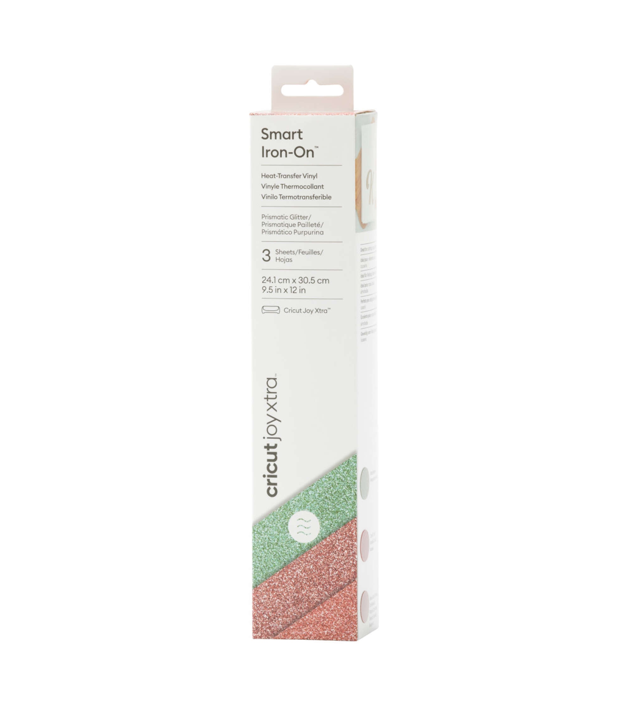 Finally, it’s glitter you can feel good about. Cricut Joy Xtra Prismatic Glitter Smart Iron-On is a microplastic- and flake-free glitter material that adds a colorful dimension to your heat-transfer project. Plus, there’s no machine mat needed — just load and go! It’s easy to make your party apparel pop and home decor dazzle — simply cut custom designs with your Cricut cutting machine, then transfer them to create your most dazzling projects. For best results, transfer using Cricut EasyPress®. Care Instructions: Apply to pre-washed and fully dried materials only Allow 24 hours after application before washing Machine wash cold, tumble dry low Do not bleach If you need to iron, only iron on the backside of the garment
