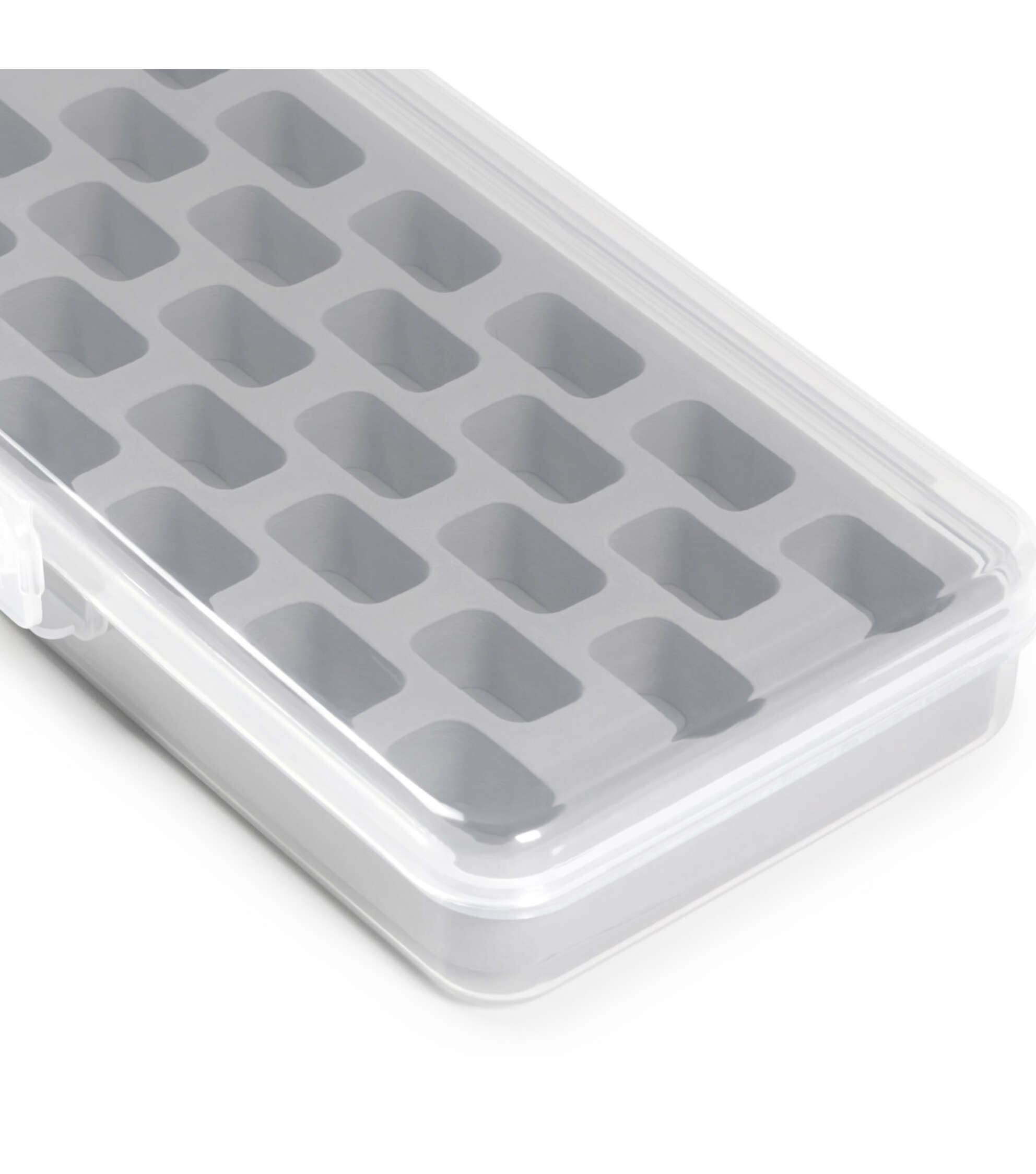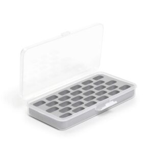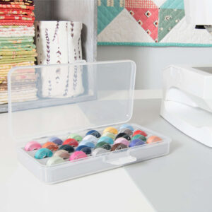 Keep bobbins neatly organized in the Dritz Plastic Bobbin Box with Latched Lid. This transparent container is constructed from lightweight plastic and can accommodate up to 28 bobbins. The compartmental design of the box prevents bobbins from tangling and helps you view your entire collection at a glance. The bobbin box is designed with a convenient latch and hinged lid for swift opening and closing.