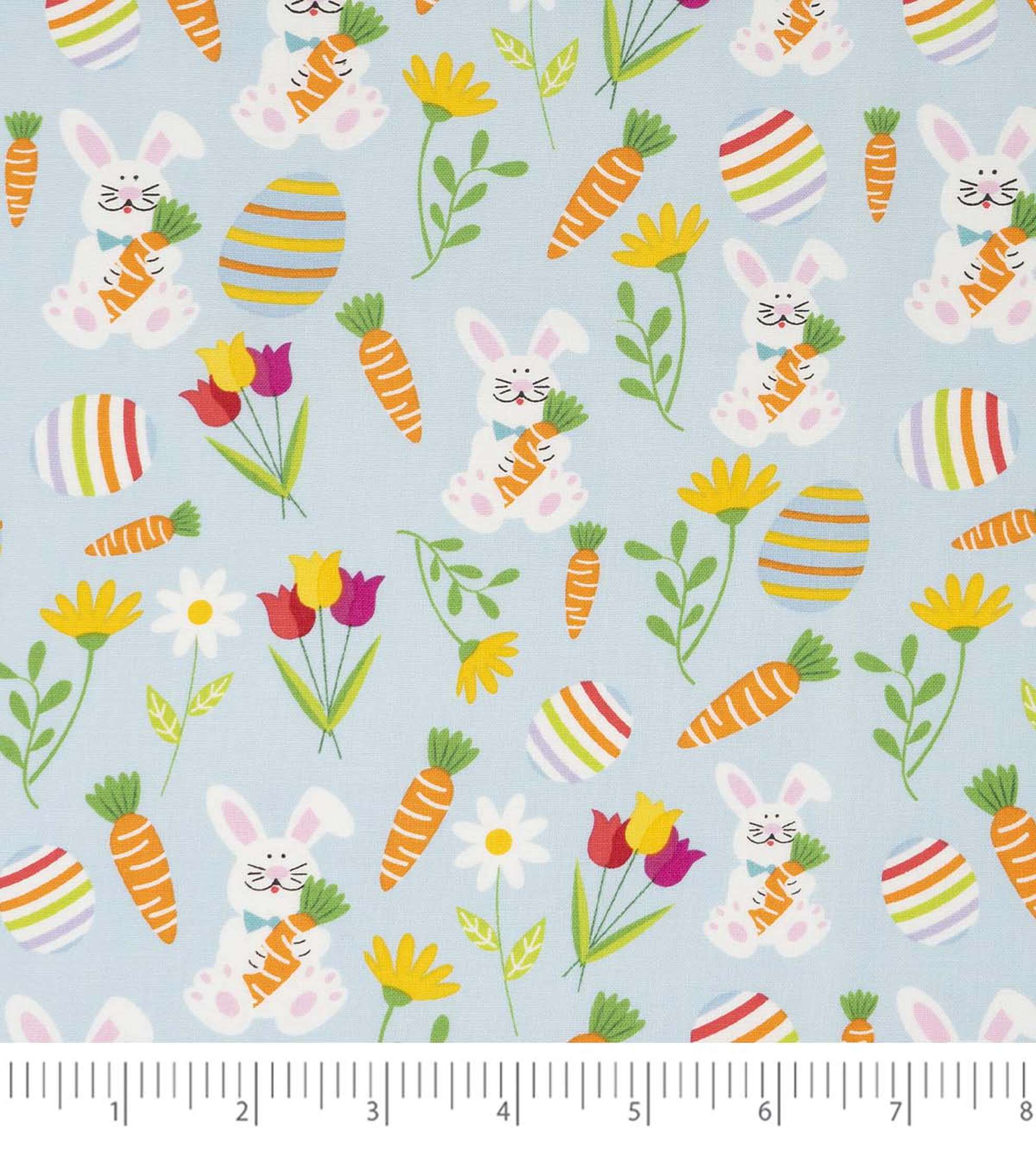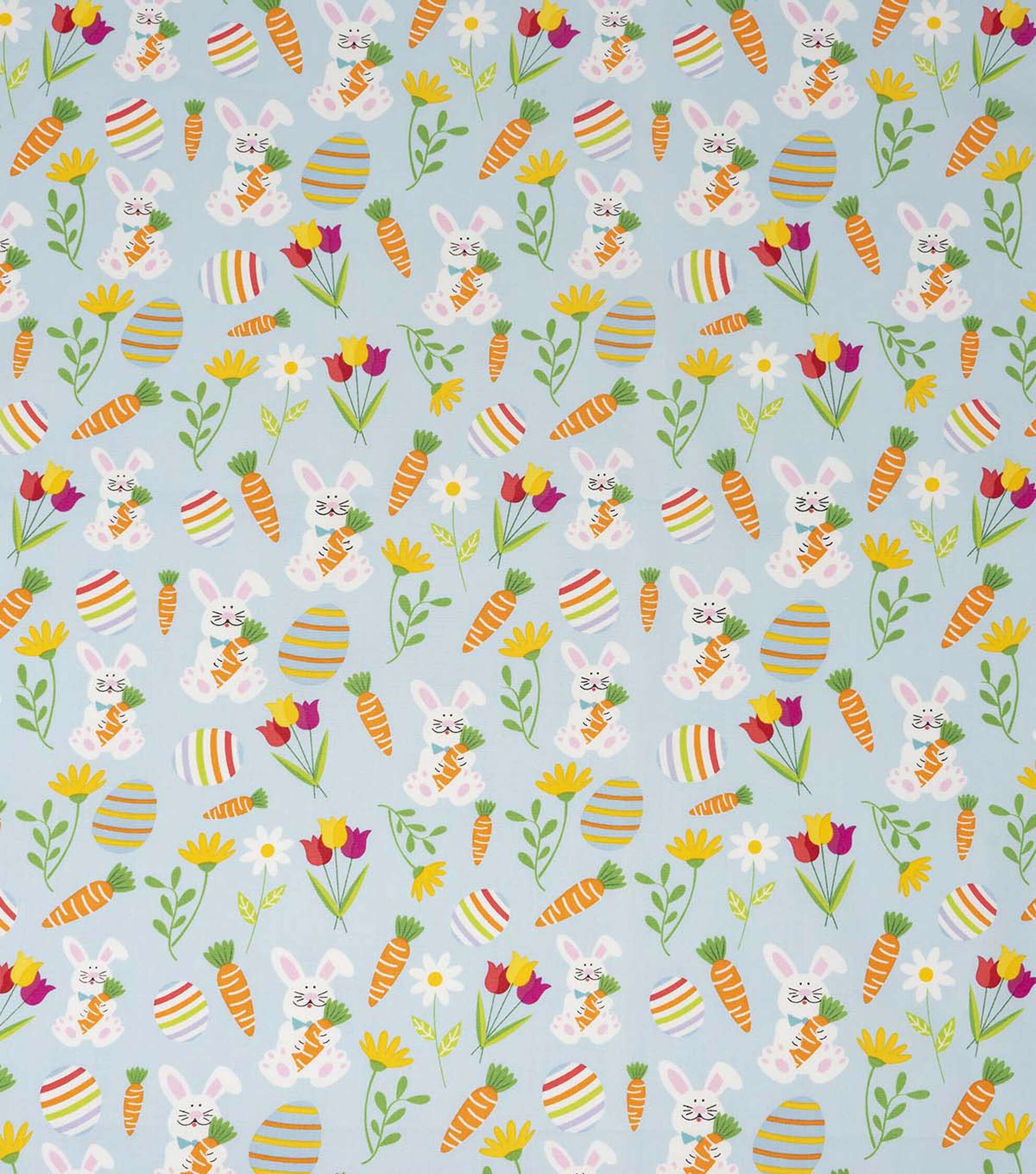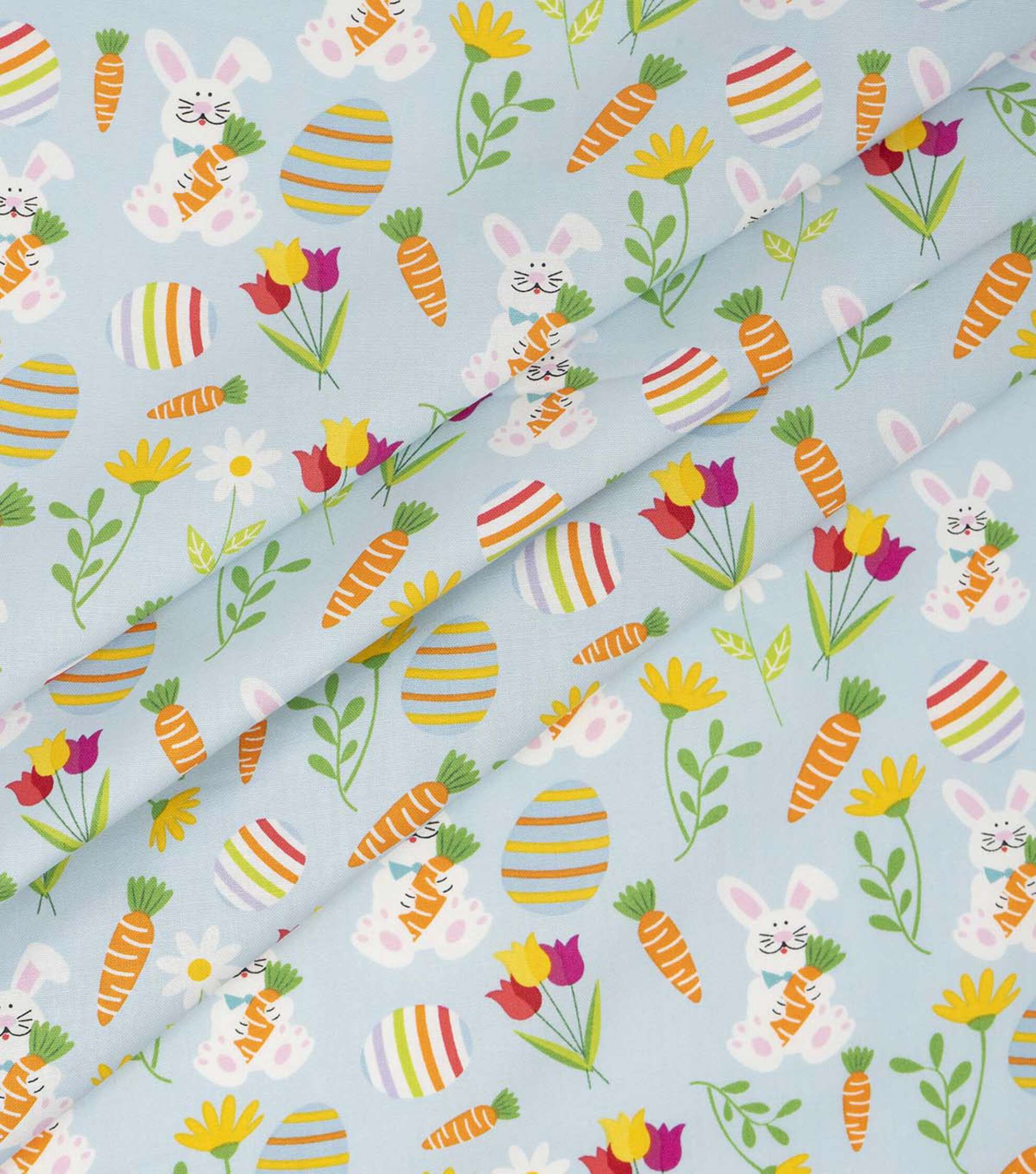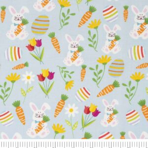 - Get Ready for Easter with our Easter Bunnies & Carrots on Blue Fabric- Looking for the perfect fabric to create your Easter crafts and decor? Look no further than our Easter Bunnies & Carrots on Blue Fabric. The adorable Easter bunny and carrot design on a blue background is sure to add a festive touch to any project. - Our fabric is easy to care for with machine wash gentle cold, tumble dry low, cool iron, and nonchlorine bleach. Use it to create quilts, crafts, apparel, Easter decor, Easter basket liners, table runners, placemats, napkins, and more. The possibilities are endless! - Product Details- Width: 44 inches