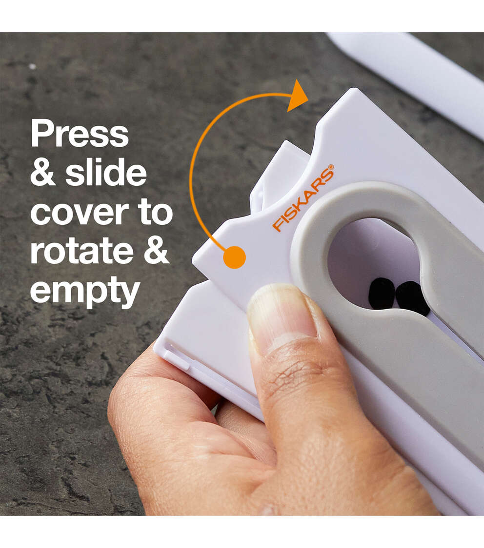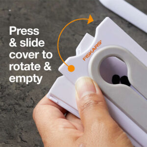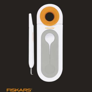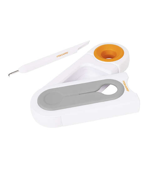 A must-have tool for anyone who creates with vinyl, the compact Fiskars® All-in-one Vinyl Weeding Tool cuts, weeds and discards negative pieces while keeping your workspace free of clutter. The cutter and weeder are safely stored inside the tool. The cutter features a high-grade steel blade that glides through rolled vinyl or transfer tape and a SoftGrip™ enhanced, ring-style handle that doubles as a hang hole. The weeder’s tip is made of durable, hardened stainless steel for weeding negative pieces easily. Use the weeder to directly place negative discard in the de-weeding slot, a built-in receptacle neatly collects them, keeping your worksurface (and your hands!) free from vinyl scraps. When finished, simply rotate the de-weeding cover to dispose of the discarded pieces. The All-in-one Vinyl Weeding Tool features a non-slip foot that holds it in place while discarding vinyl into the de-weeding slot.
