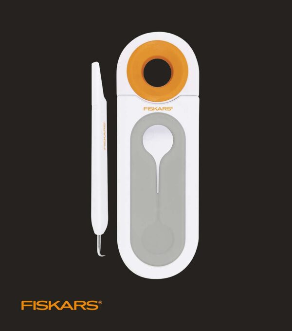 A must-have tool for anyone who creates with vinyl, the compact Fiskars® All-in-one Vinyl Weeding Tool cuts, weeds and discards negative pieces while keeping your workspace free of clutter. The cutter and weeder are safely stored inside the tool. The cutter features a high-grade steel blade that glides through rolled vinyl or transfer tape and a SoftGrip™ enhanced, ring-style handle that doubles as a hang hole. The weeder’s tip is made of durable, hardened stainless steel for weeding negative pieces easily. Use the weeder to directly place negative discard in the de-weeding slot, a built-in receptacle neatly collects them, keeping your worksurface (and your hands!) free from vinyl scraps. When finished, simply rotate the de-weeding cover to dispose of the discarded pieces. The All-in-one Vinyl Weeding Tool features a non-slip foot that holds it in place while discarding vinyl into the de-weeding slot.