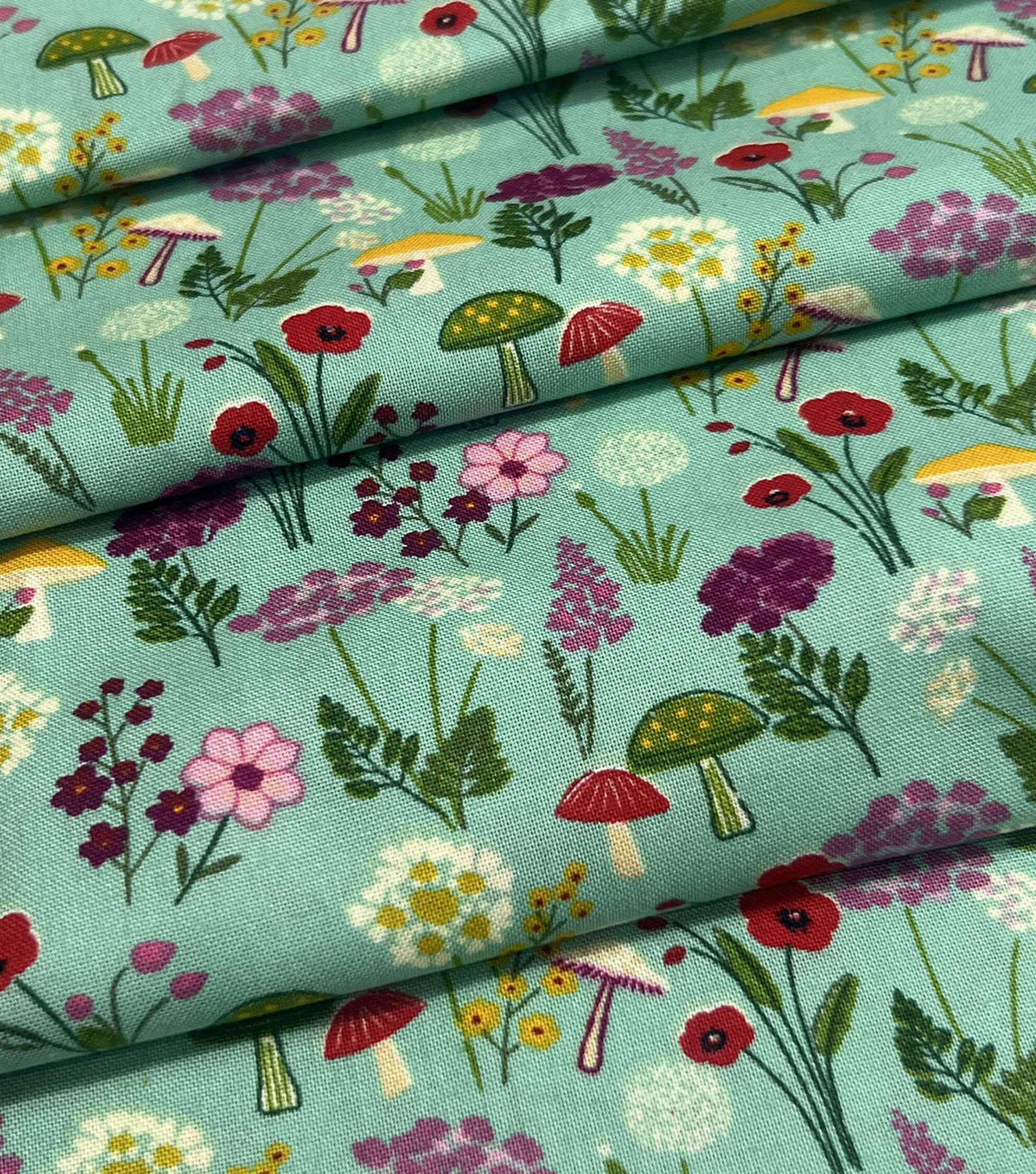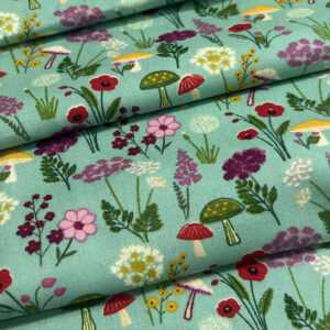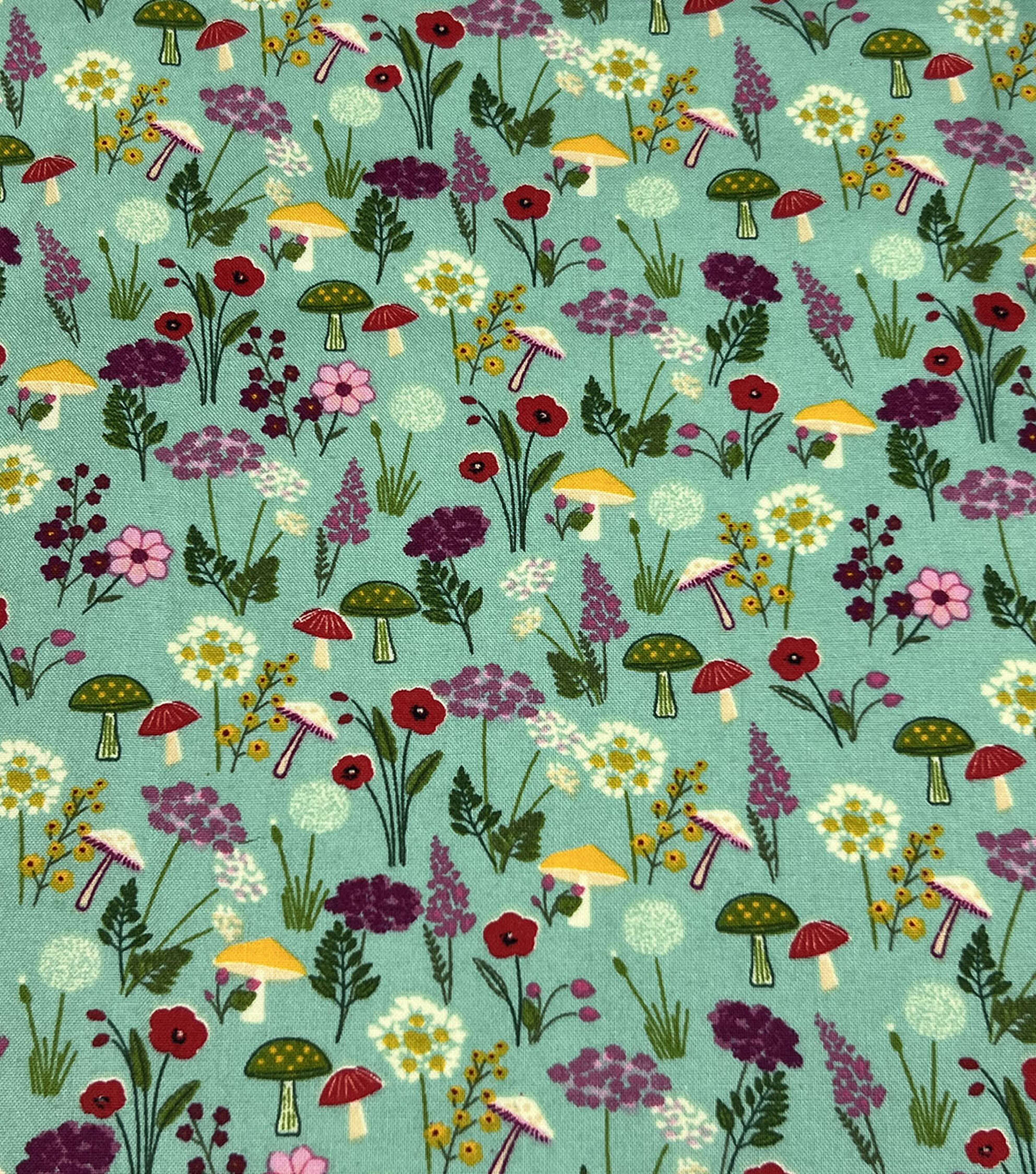 Bring the beauty of nature into your home with this stunning cotton fabric featuring a delightful print of flowers and mushrooms on a green background. The high-resolution print captures every intricate detail, making it perfect for a variety of projects.