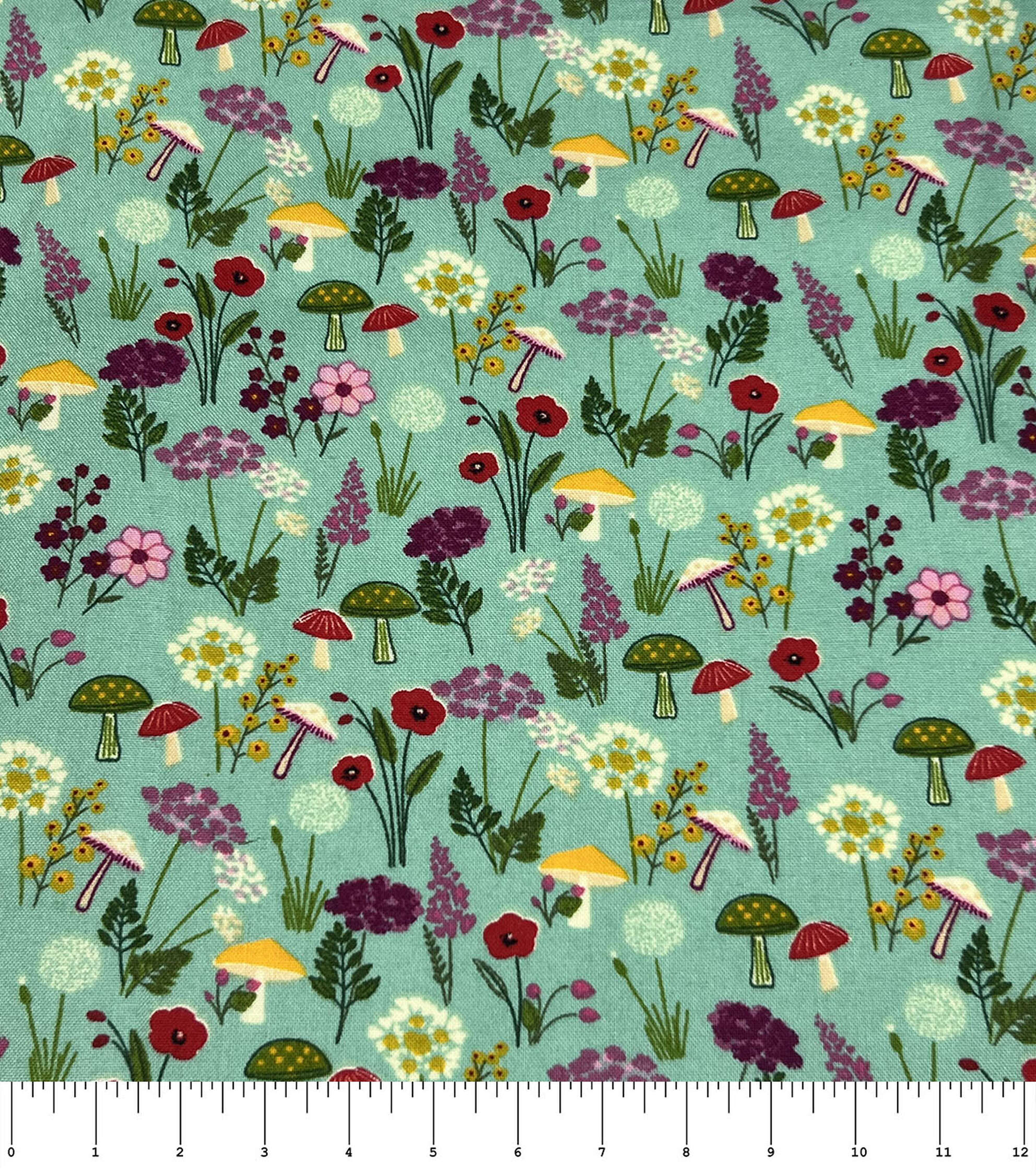Experience the Beauty of Nature with Flowers & Mushrooms on Green Cotton Fabric by Keepsake Calico