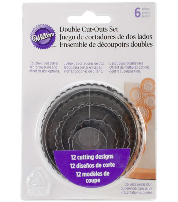 WILTON-Fondant Double Cutters Set. Create a variety of fondant decorations in different sizes to decorate cakes and sweet treats. This durable set features a straight and crinkle side; which gives you twice the cutting options as well as additional layering effects. This package contains six double-sided cutters in a variety of colors. Comes in different designs. Each sold separately. Imported.