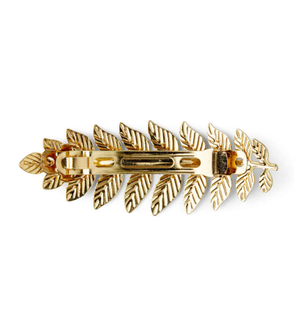Lend an exquisite and chic look to your hairdo with this one-of-a-kind hildie & jo Leaves Gold Barrette. In smooth gold, the barrette is an intricately designed branch with multiple leaves for visual charm. It’s carved from iron and features an auto lock closure for ease of use. Tuck in anything from a messy waterfall to side ponies and more using this gorgeous piece of hair accessory.