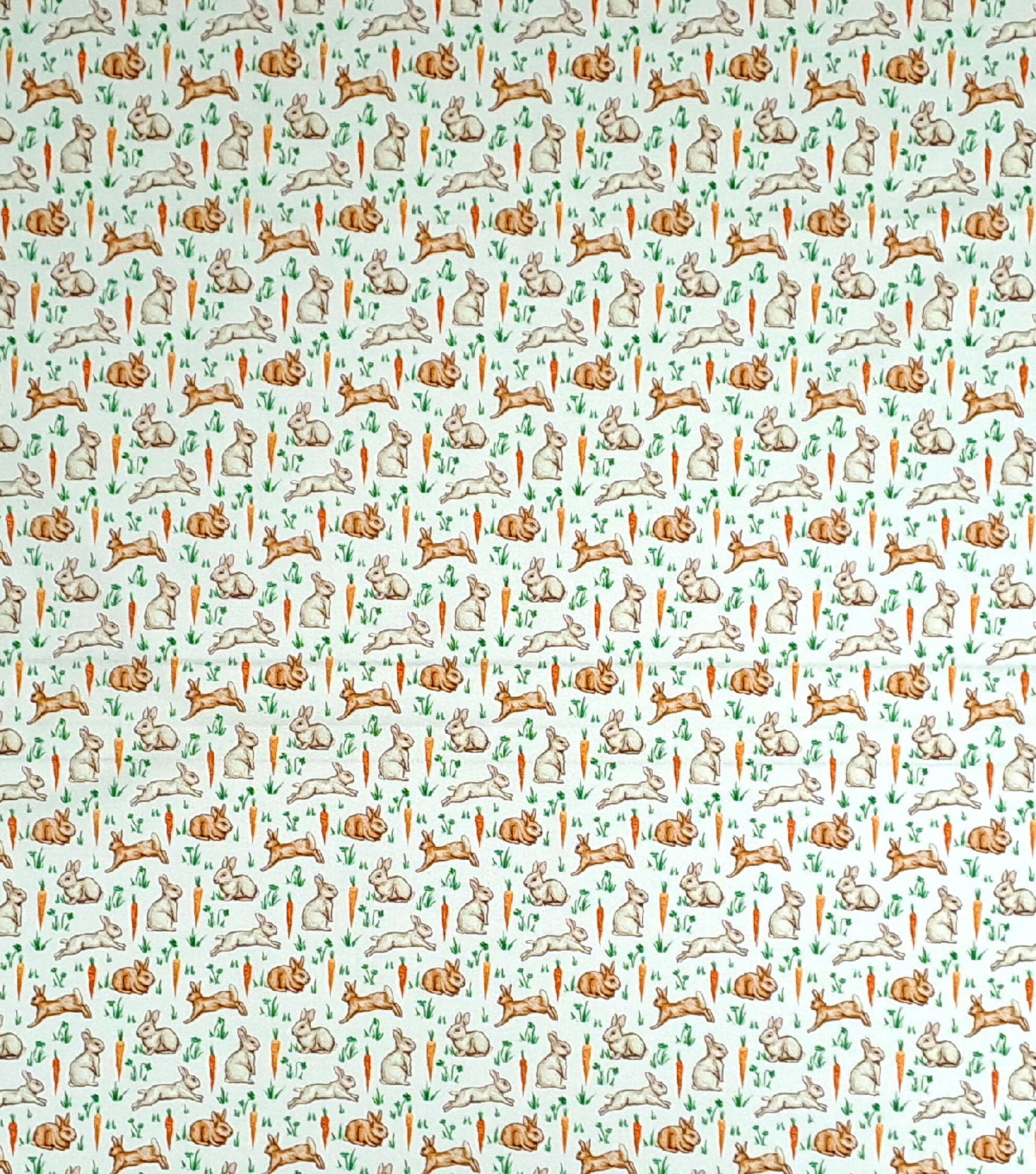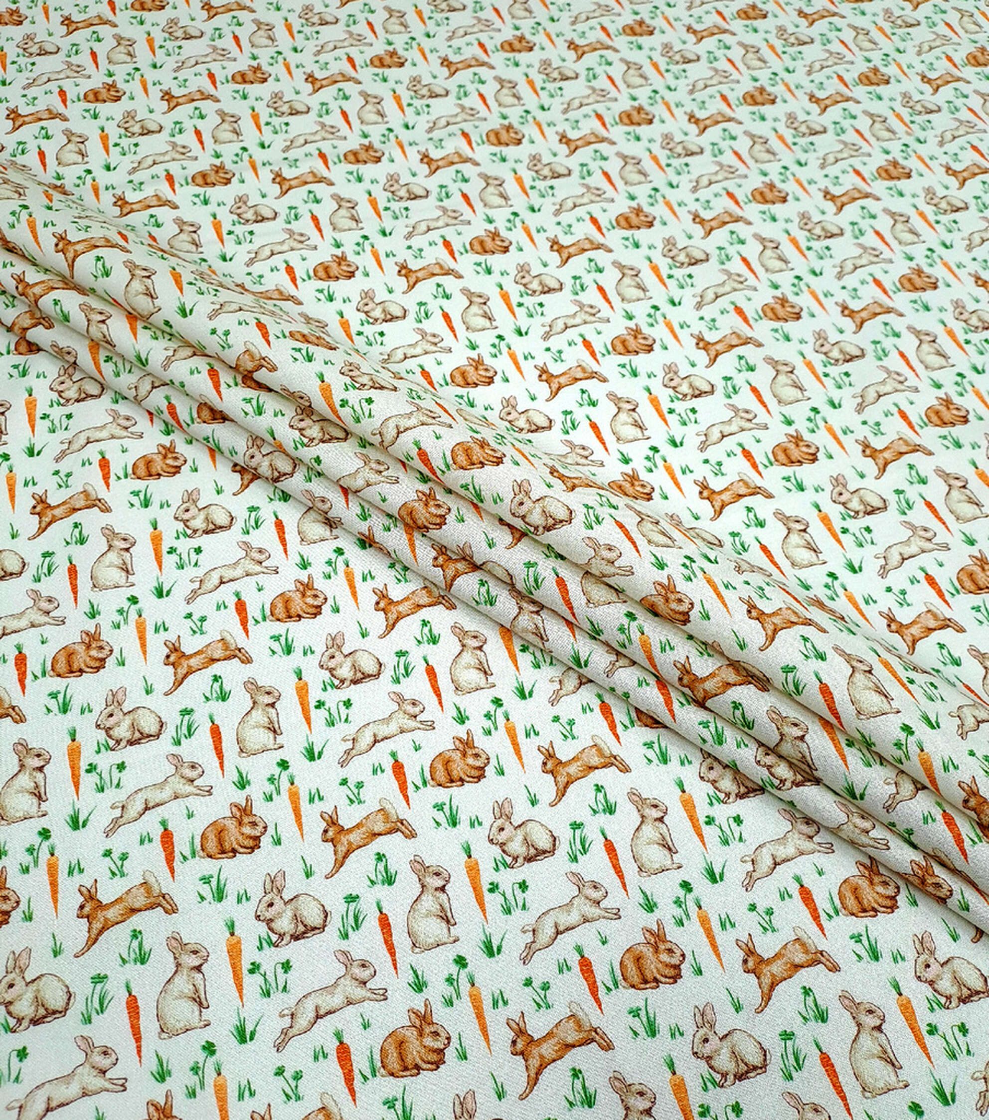 Bring the joy of Easter to your home with our Hopping Bunnies & Carrots on Cream Cotton Fabric. This delightful fabric features adorable bunnies and carrots, perfect for creating Easter-themed quilts, crafts, apparel, and decor. The 44-inch width and 100% cotton material make it easy to work with.