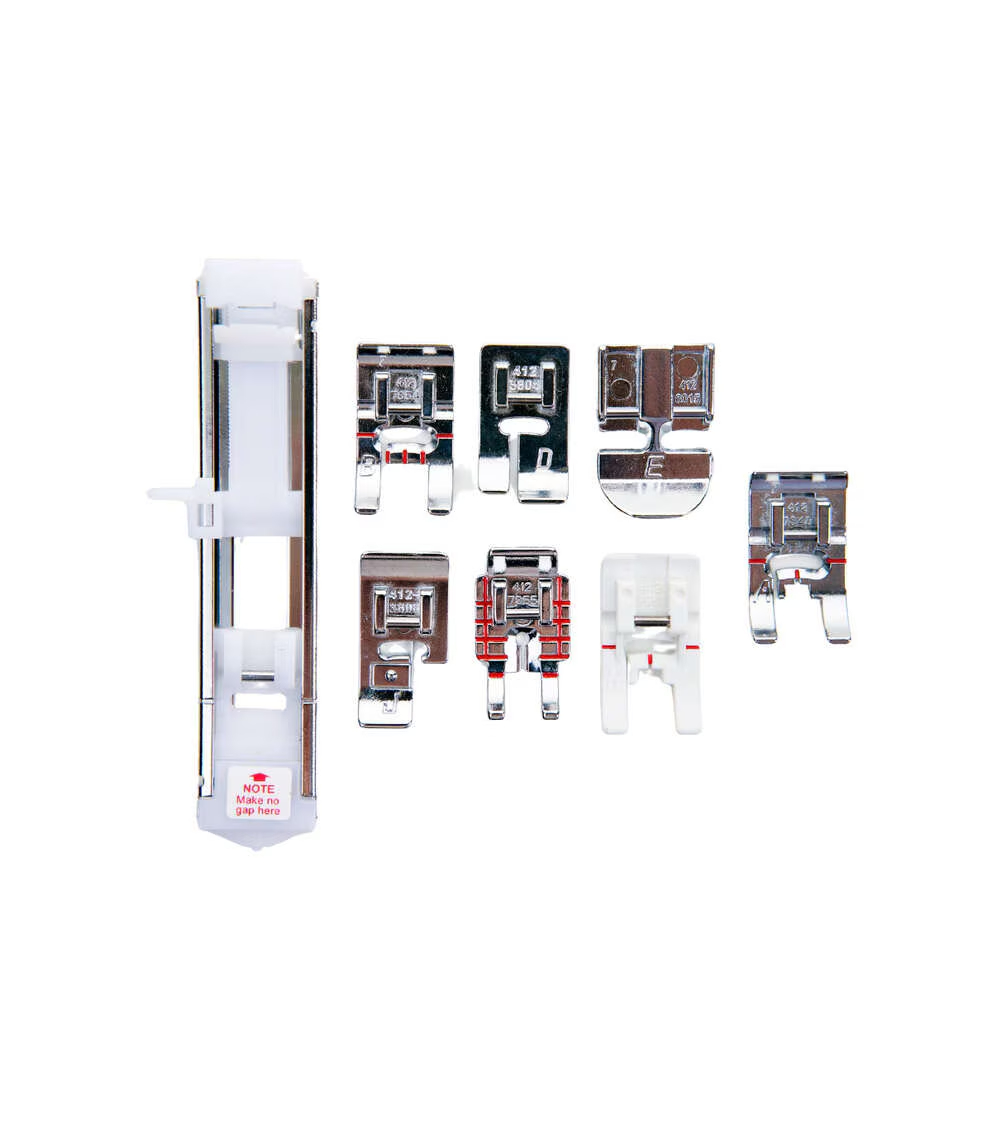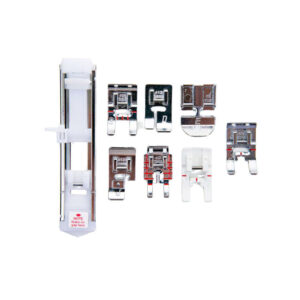 - Included Accessories: Utility (A) Foot, Overcast (J) Foot, Satin (B) Foot, Quilter’s ¼” Piecing (P) Foot, Buttonhole Slider (C) Foot, Non-stick Glide Foot, Blind Hem (D) Foot, Zipper (E) Foot, Assorted Needle Pack, L Screwdriver, Seam Ripper/Brush, Bobbins, Seam Guide, Spool Pin Felt, Vertical Spool Pin, Large Spool Cap