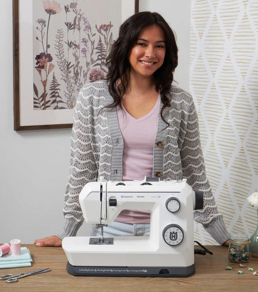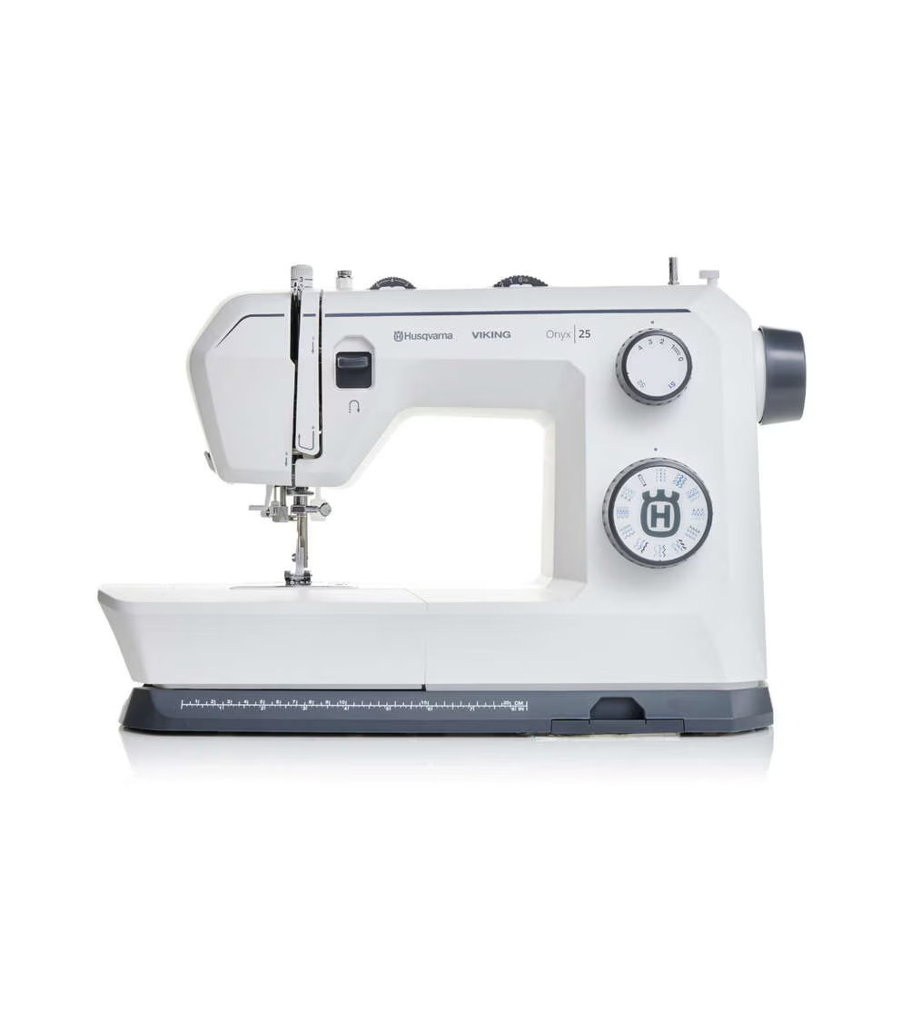 The Onyx™ 25 sewing machine combines a dependable mechanical interface with modern sewing features, perfect for utility stitching and beyond. With 32 stitches, auto needle threader, and sewing advisor cards, the ONYX™ 25 is an easy-to-use mechanical sewing machine with beyond-basic sewing features that give you room to grow your skills.