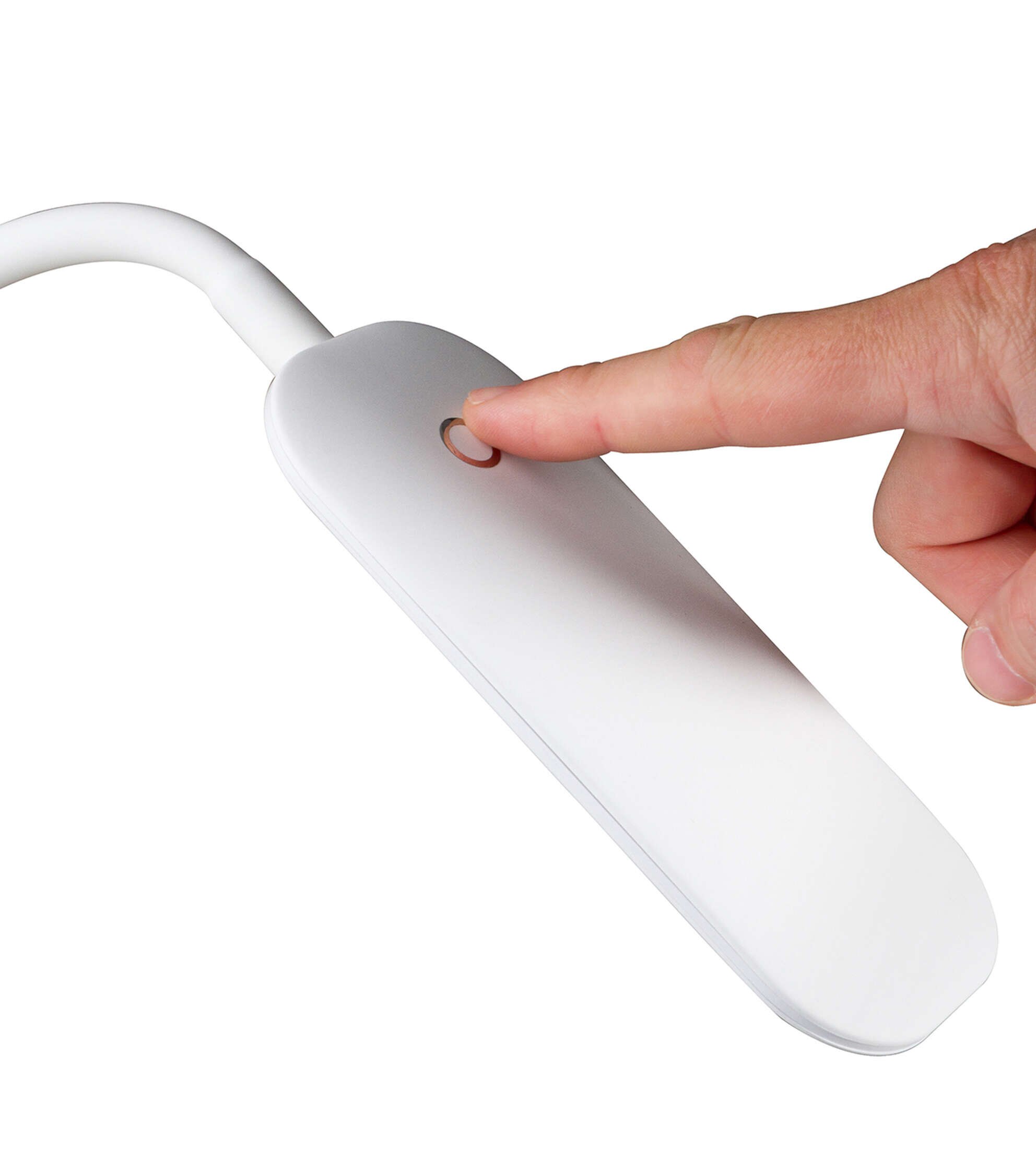 Bring great lighting into small spaces with the OttLite Flexible Soft Touch LED Clip Lamp. with the spring-loaded clip, attach securely to tables, bookshelves, and more. The super flexible neck adjusts the height from 4 to 18.5 inches to direct the clear, crisp natural daylight ClearSun LED illumination right where you need it. Proprietary ClearSun LEDs reduce glare and eyestrain for hours of focused, productive time. This OttLite lamp features a soft-touch texture on rubberized neck and shade. Easily adjust the three brightness settings with touch activated controls.