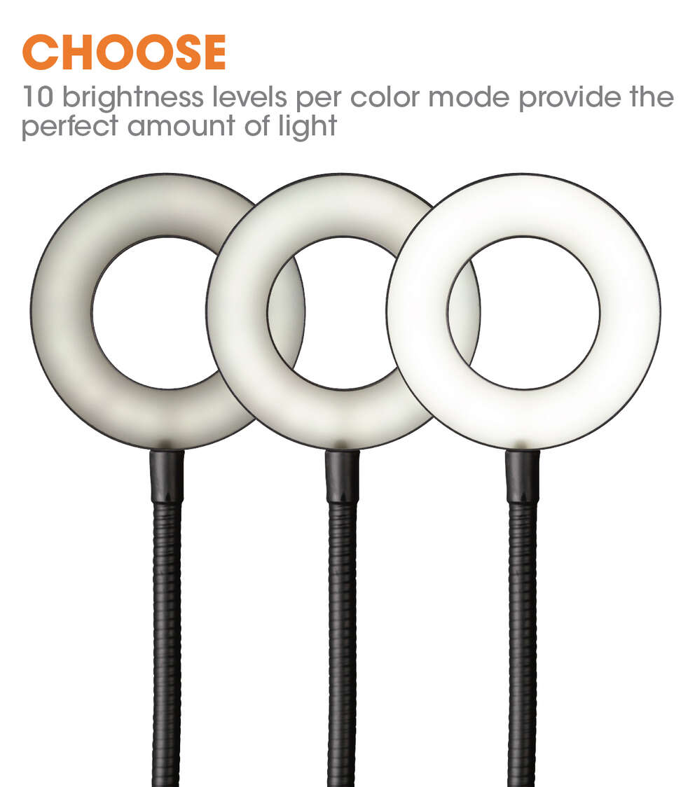 Grab the perfect selfie, shine some extra light for your video call, light your workspace beautifully. The OttLite Dimmable Ring Light with Clip provides versatile lighting that you can position perfectly with the 20+-inch long neck and sturdy clip. Great as a desk lamp for reading, computer work and projects, this ring light features ClearSun LED technology to reduce eyestrain and glare. And, with three dimmable color temperatures (warm light, bright white and ClearSun natural daylight), you can easily create the lighting effect you want. To operate, simply plug into a standard USB port on your computer or adaptor (adaptor not included).
