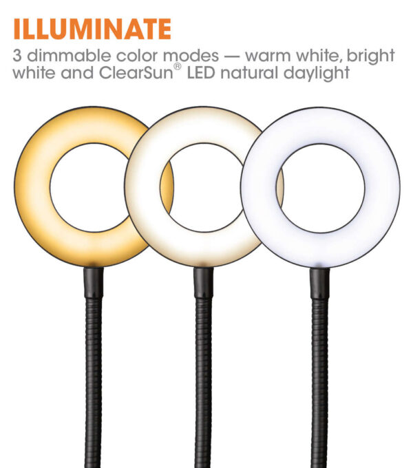 Grab the perfect selfie, shine some extra light for your video call, light your workspace beautifully. The OttLite Dimmable Ring Light with Clip provides versatile lighting that you can position perfectly with the 20+-inch long neck and sturdy clip. Great as a desk lamp for reading, computer work and projects, this ring light features ClearSun LED technology to reduce eyestrain and glare. And, with three dimmable color temperatures (warm light, bright white and ClearSun natural daylight), you can easily create the lighting effect you want. To operate, simply plug into a standard USB port on your computer or adaptor (adaptor not included).