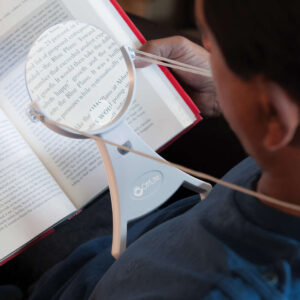 Crystal-clear lens features a vanishing edge for uninterrupted viewing. Adjustable cord and no-slip rubberized feet keep magnifier in place.