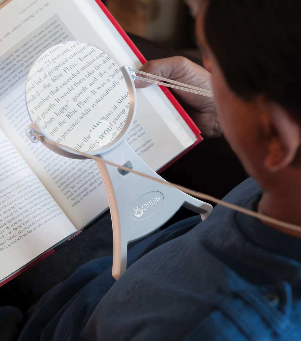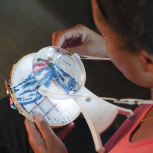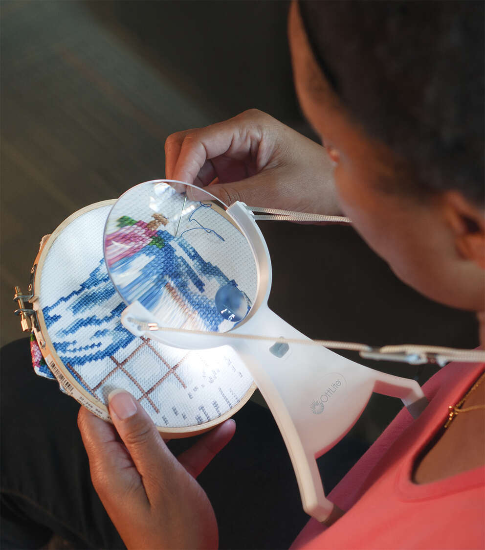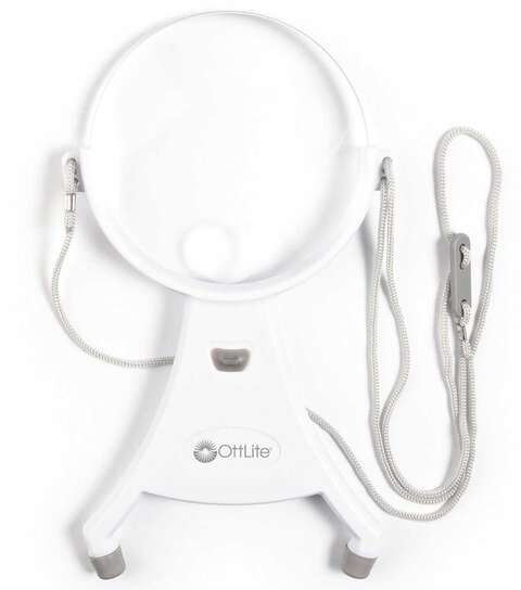 Perfect for needlepoint, reading, jewelry making or any fine-detail activity where both hands are needed, the OttLite 4-inch Hands-Free LED Magnifier provides super bright OttLite LED illumination and powerful magnification. Simply place the cord around your neck and adjust the length to meet your viewing needs. The no-slip rubberized feet keep the magnifier perfectly in place above your work so your hands are free. And, the 1.5x optical-grade acrylic magnifier features a powerful 4.25x spot viewer and a rimless edge for uninterrupted viewing.